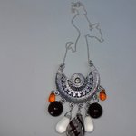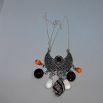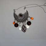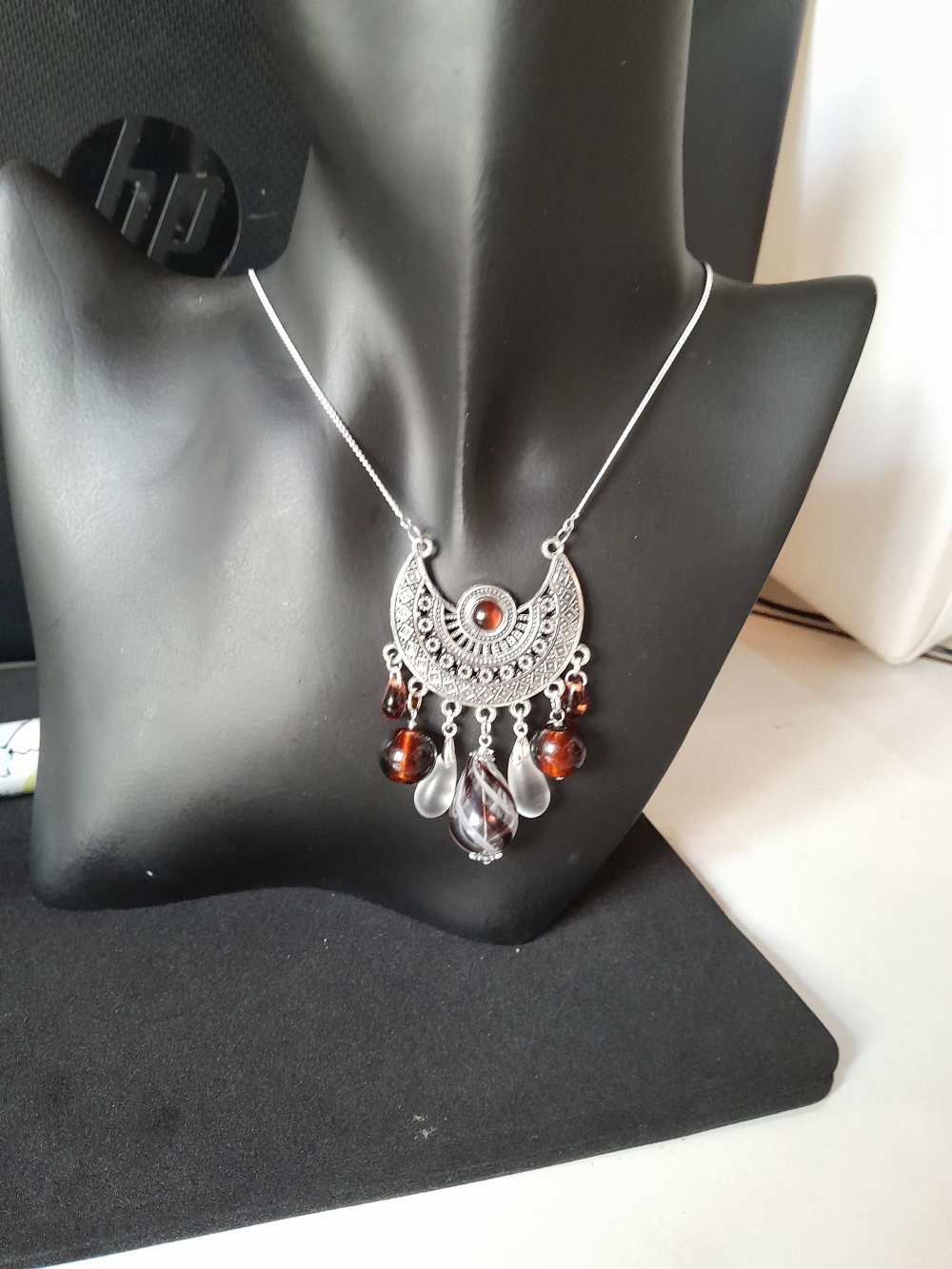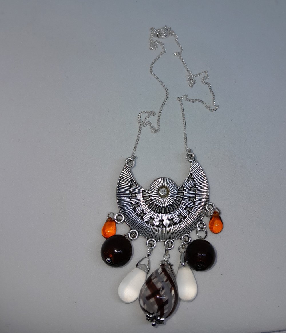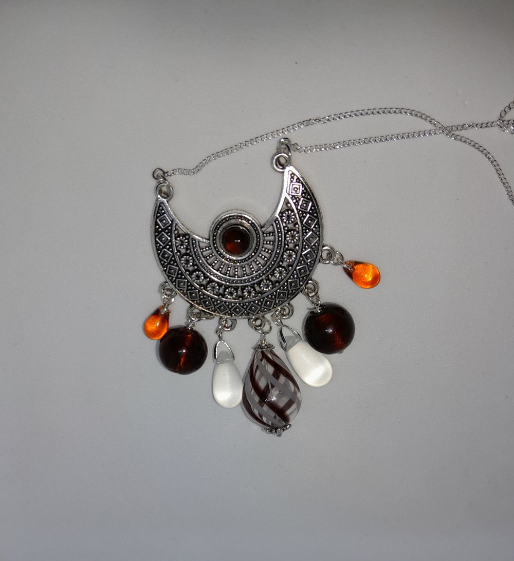 collier en forme de chevron avec 1 quartz fumé 6 mm, 1 perle de verre de Murano 25 mm et 2 perles de verre de Bohème 12 mm, 2 perles de verre de bohème de 12, 2 perles de verre de bohème 6 mm, livré avec chaine en argent 925 sterling de 40 cm.