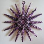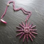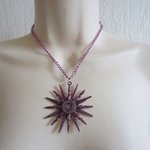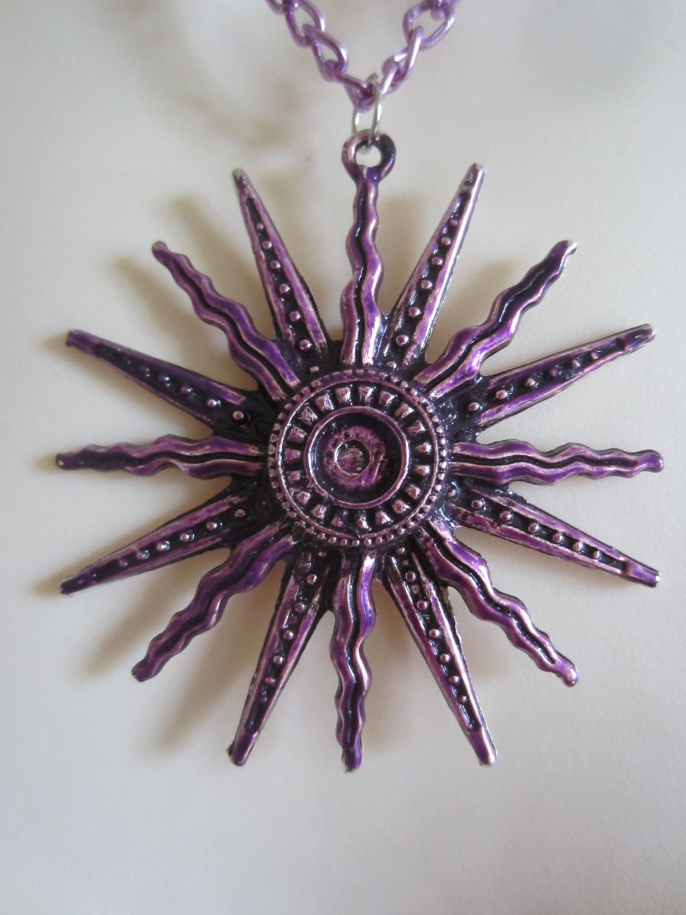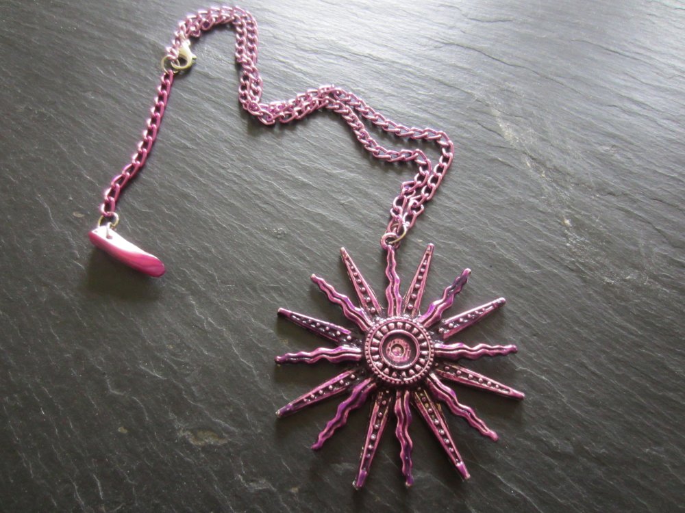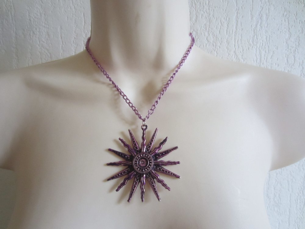Joli collier neuf. Il est composé d’une chaîne en aluminium violette. Le pendentif est un soleil en métal violet (6 cm x 6 cm). Fermoir à mousqueton avec chaînette de réglage pour les finitions.