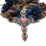 Croix en métal argentée décorée a la main a base de vernis rose et marron et recouvert de résine