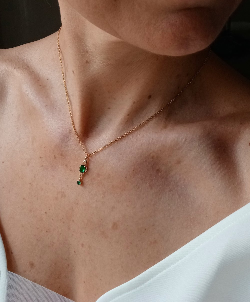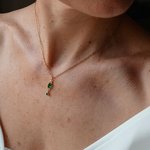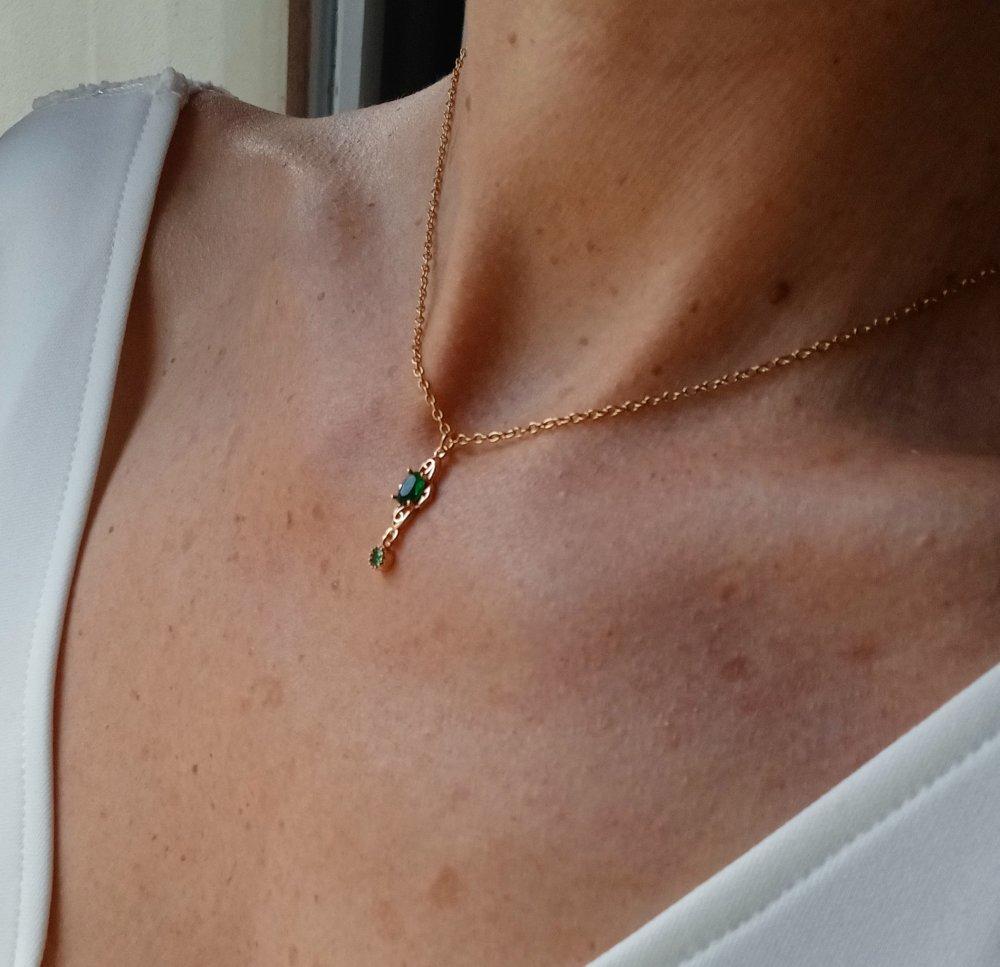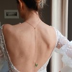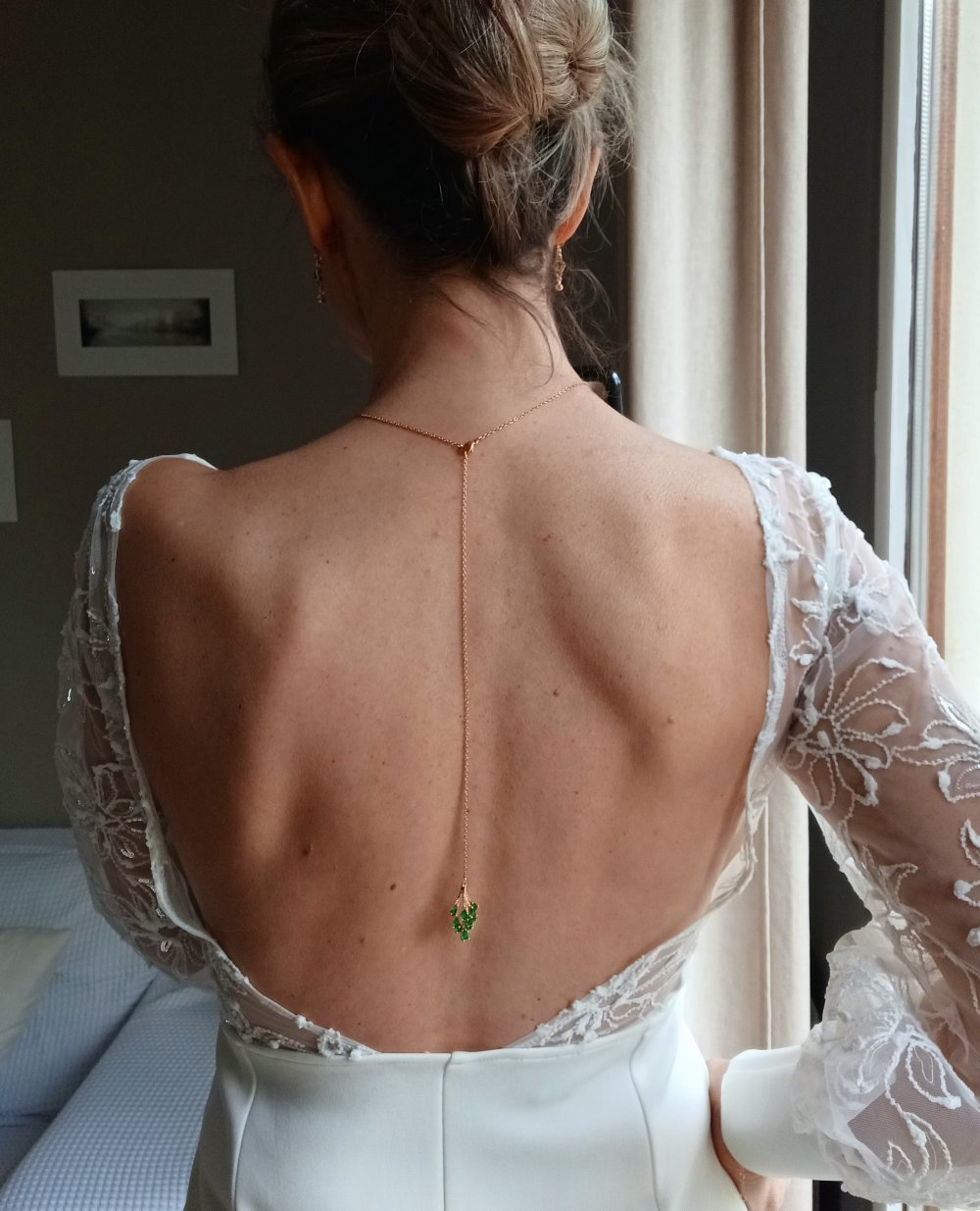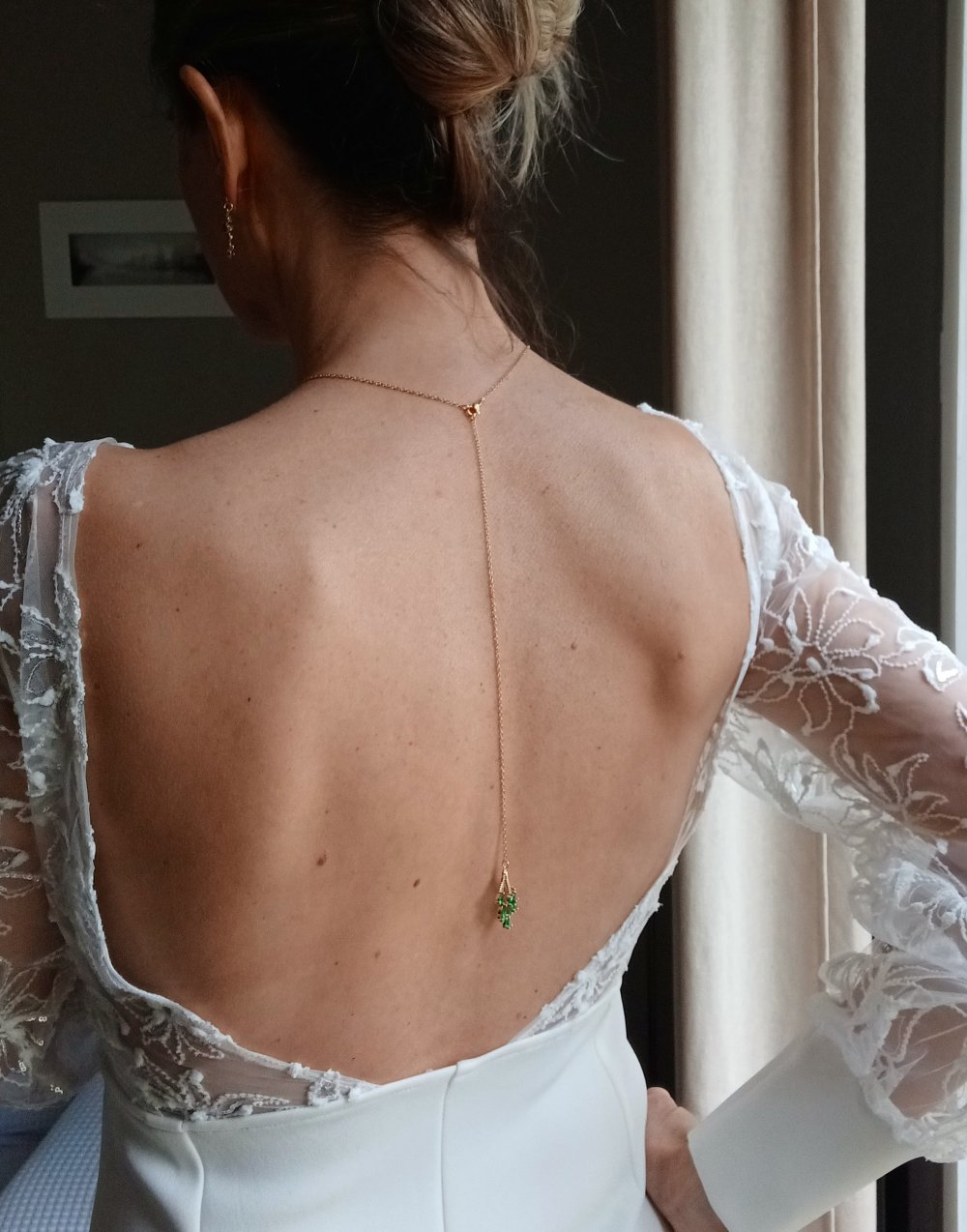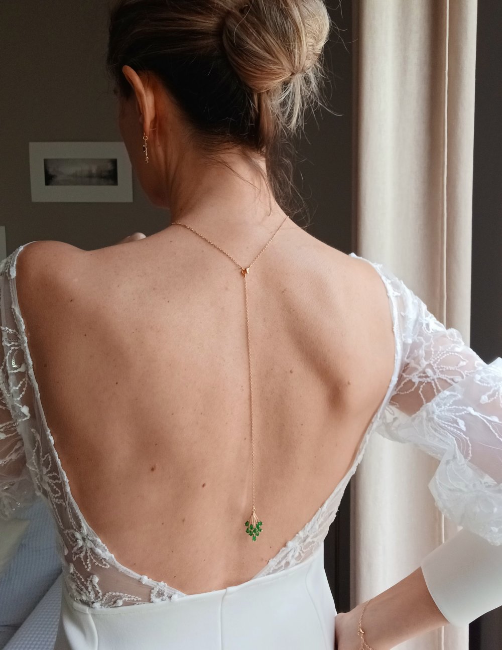 Sublime collier de dos réalisé pour la mariée ou la demoiselle d'honneur avec chaîne en acier or et sertis en cristal vert émeraude.