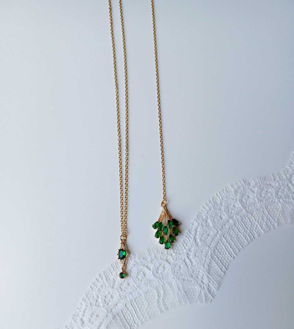 Collier dos nu vert émeraude- bijou dos nu vert et or- collier et parure de mariage- bijoux bohèmes- bijoux Paon plumes de sertis vert émeraude.