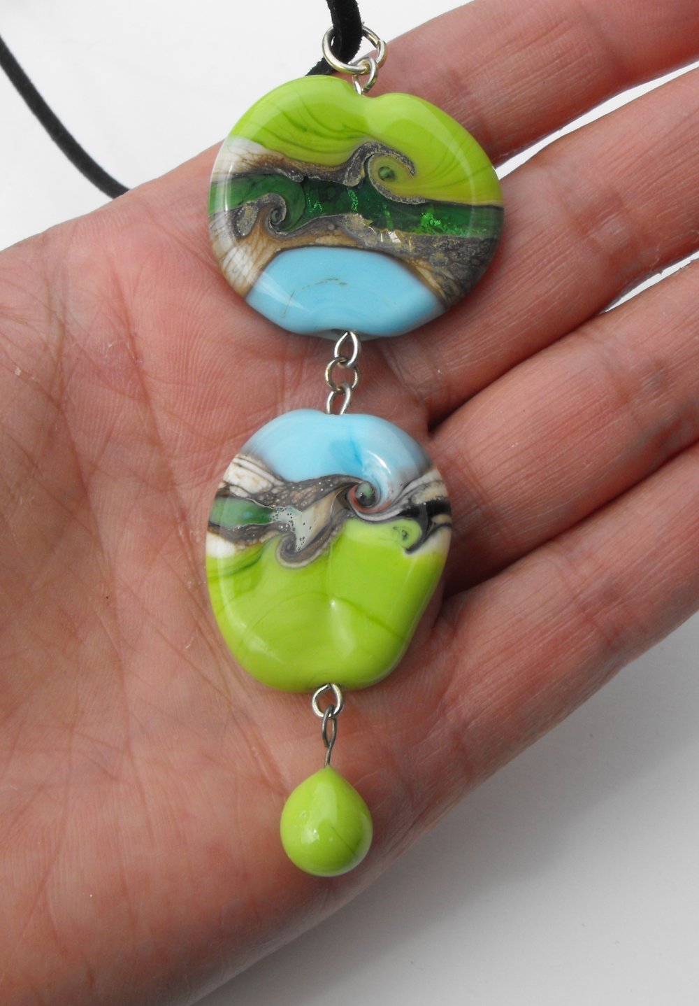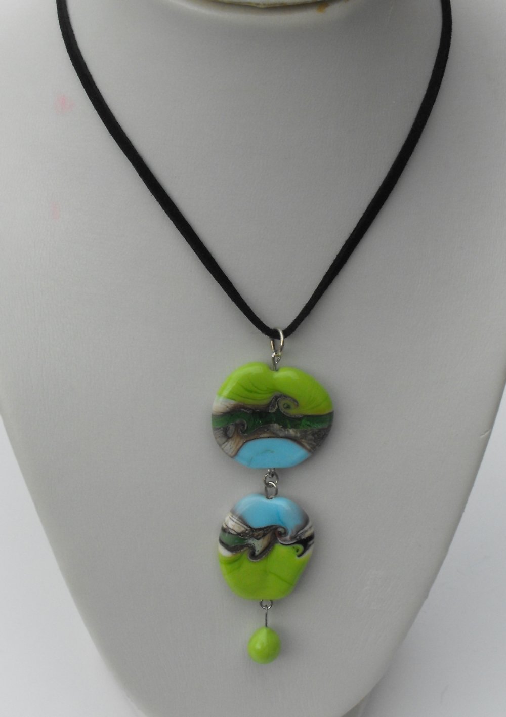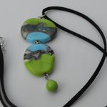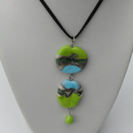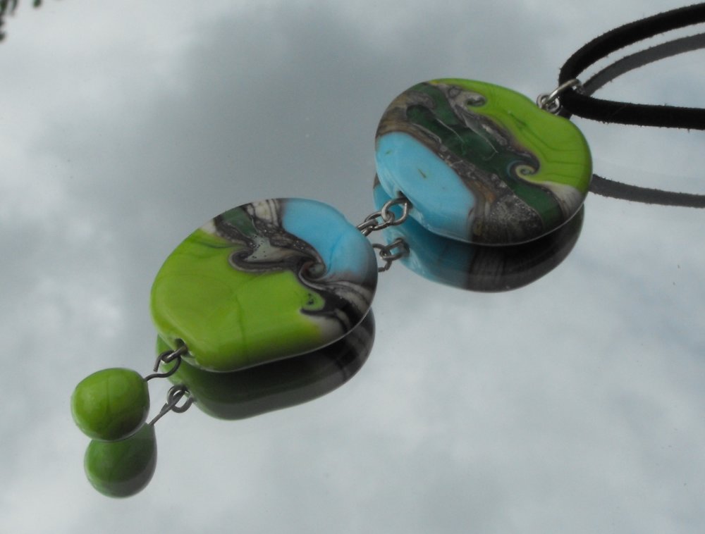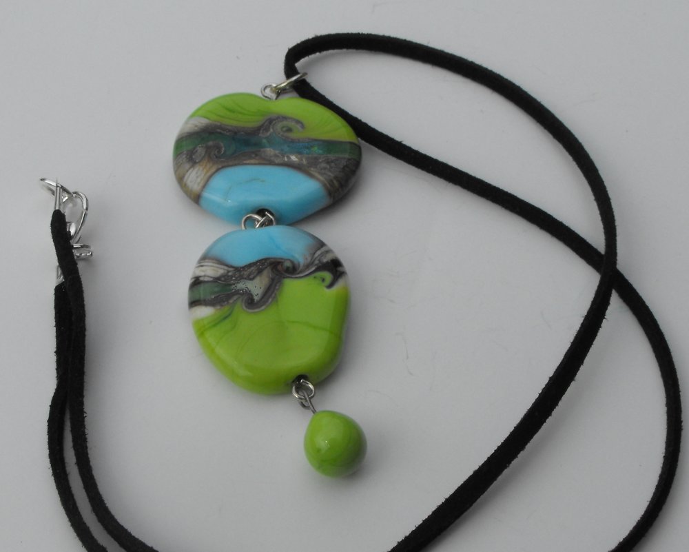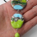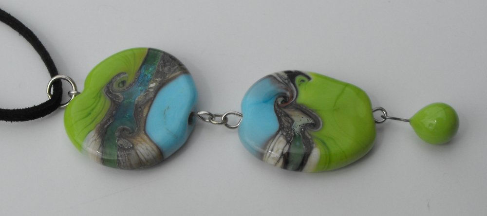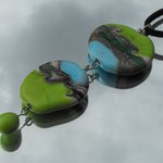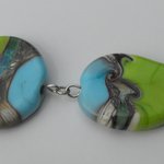 constitué de deux perles plates décor sur fond vert anis et bleu turquoise + une perle goutte couleur vert anis