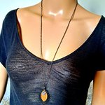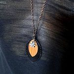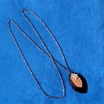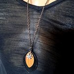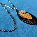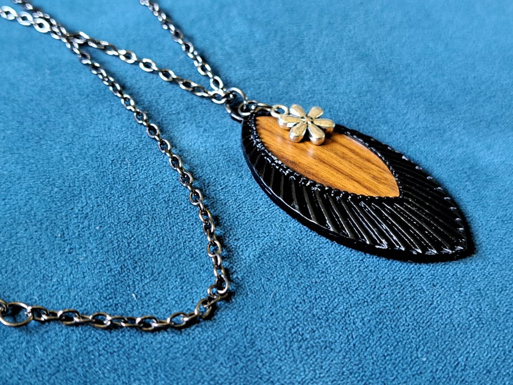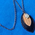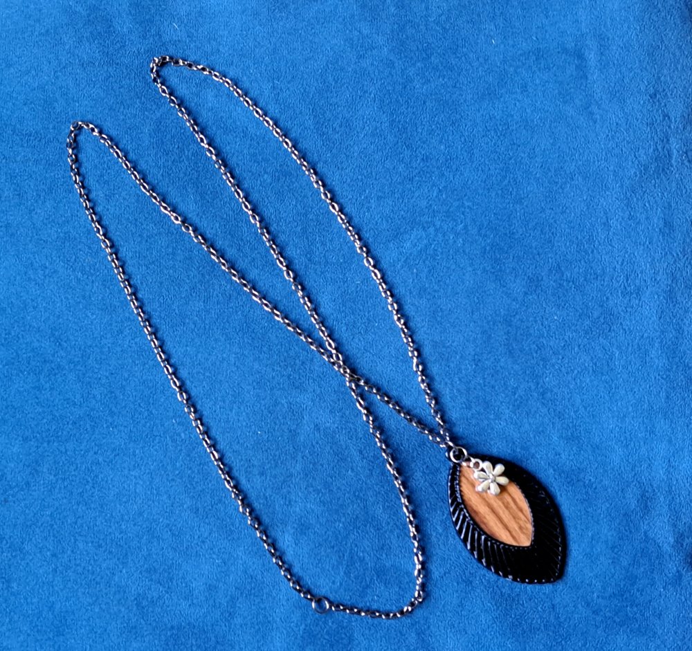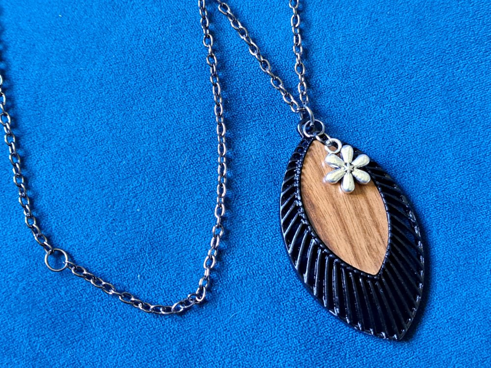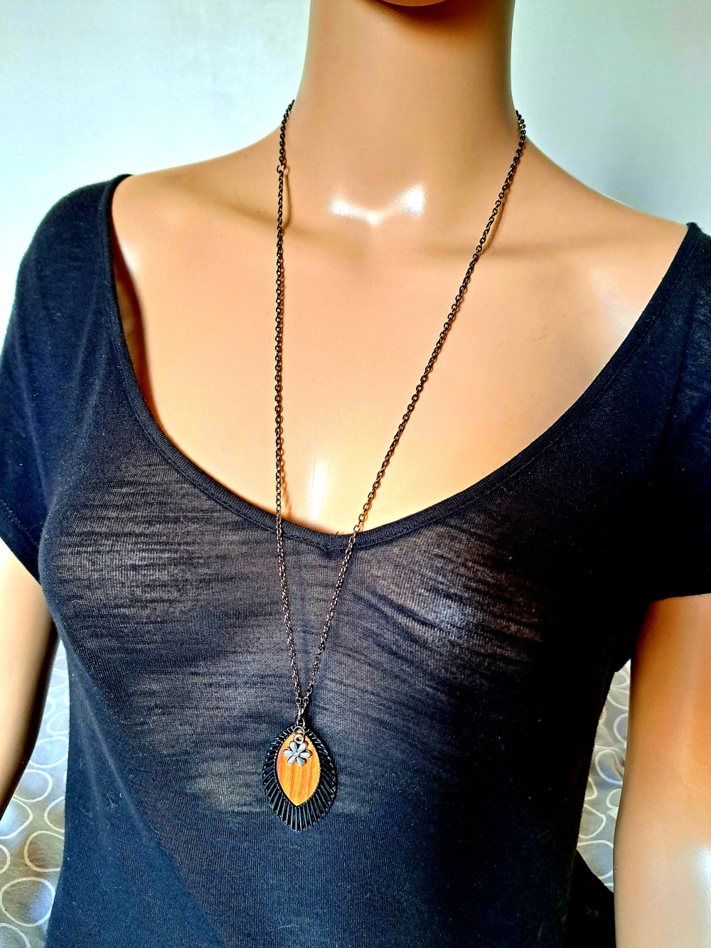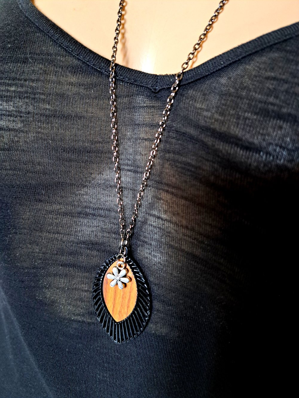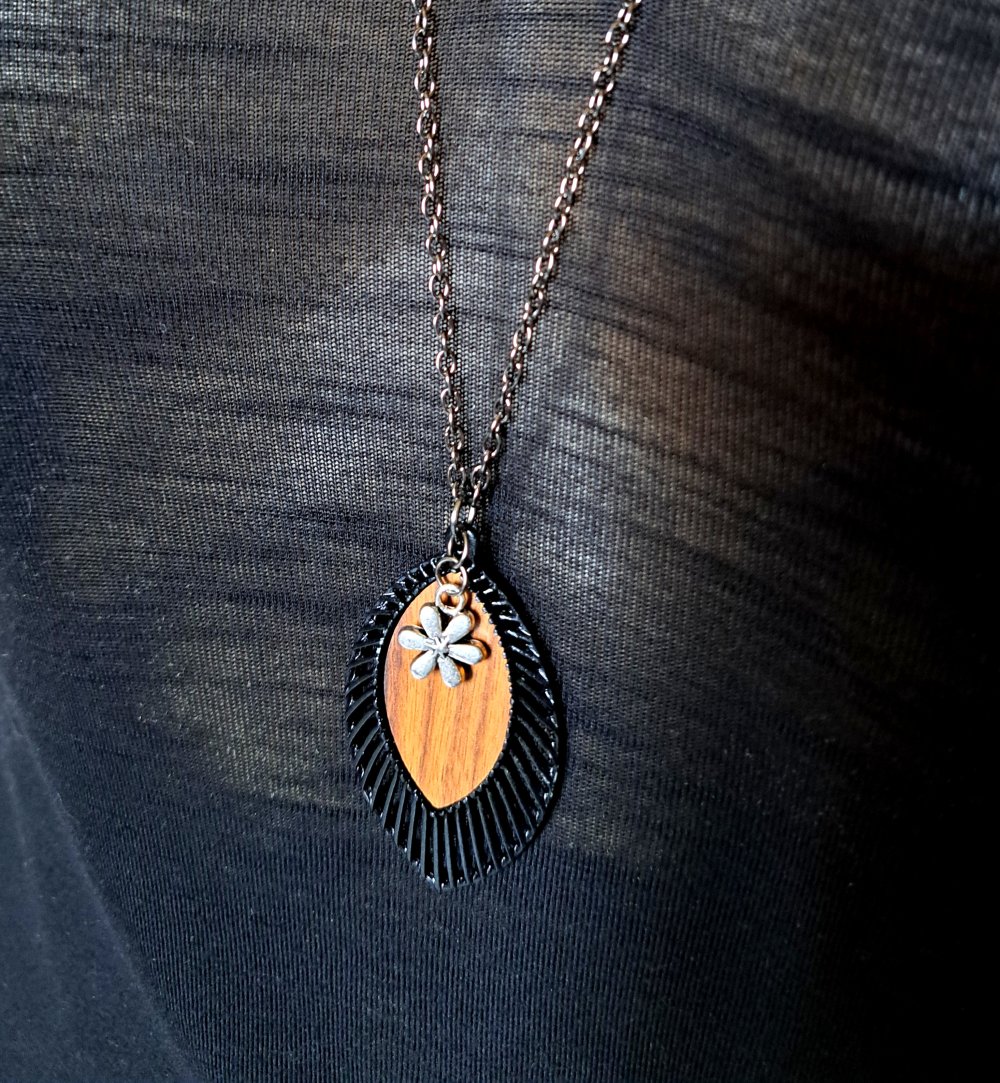 sautoir collier pendentif noir et marron initiation bois, fleure argenté, fermoir, chaîne métal noir