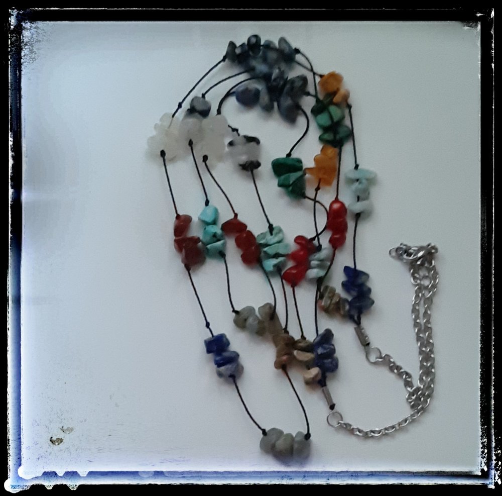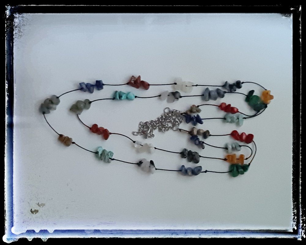 perles chips montées sur fil polyamide, chaine et fermoir en acier