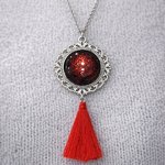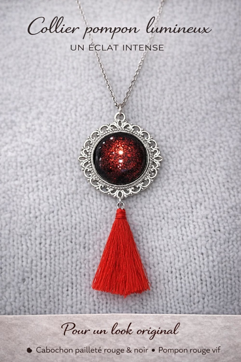 Voici un jolie sautoir, avec sa chaîne en acier inoxydable de 60cm accompagner d'un support rond argenté et son cabochon de 20mm aux couleurs rouge pailleté sur fond noir ainsi qu'un pompon rouge.