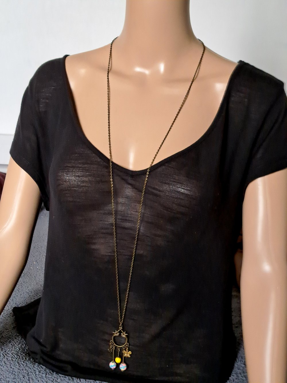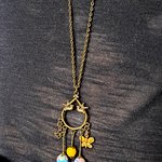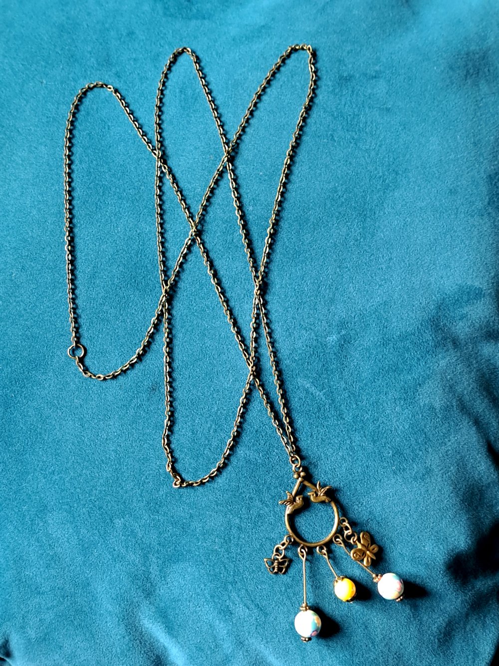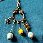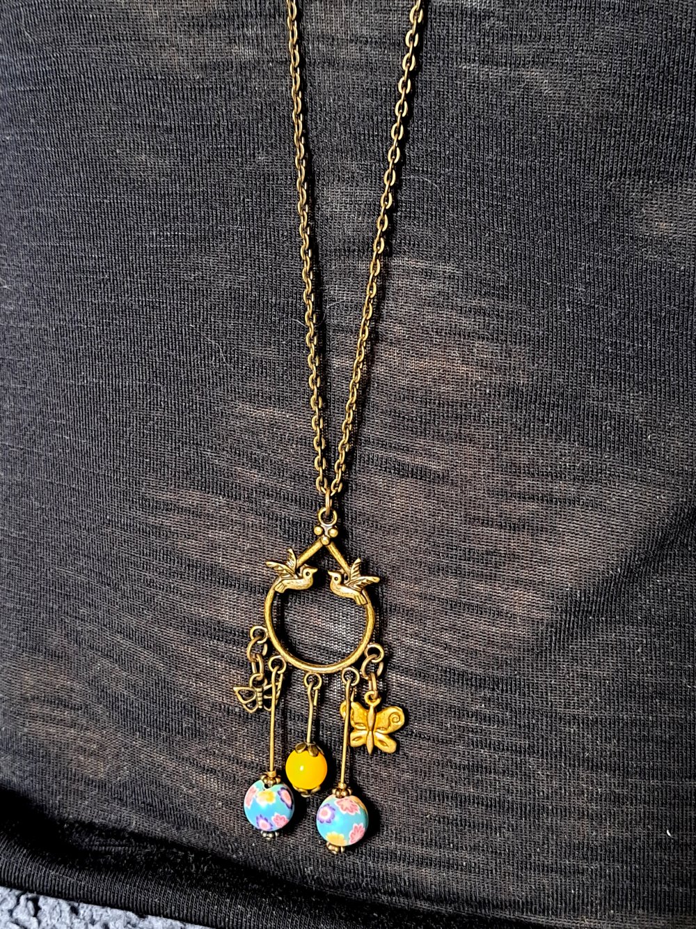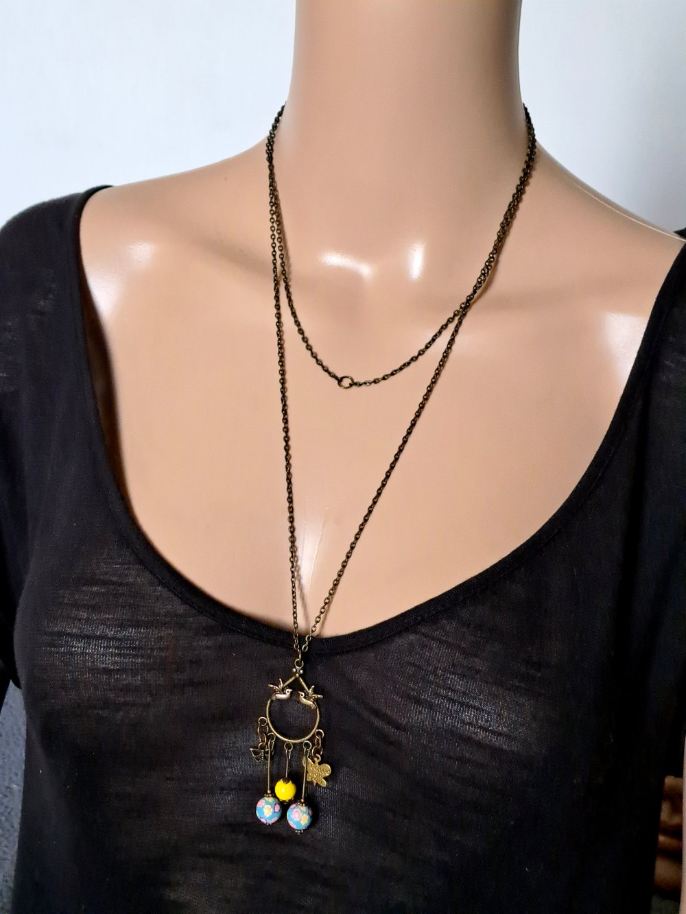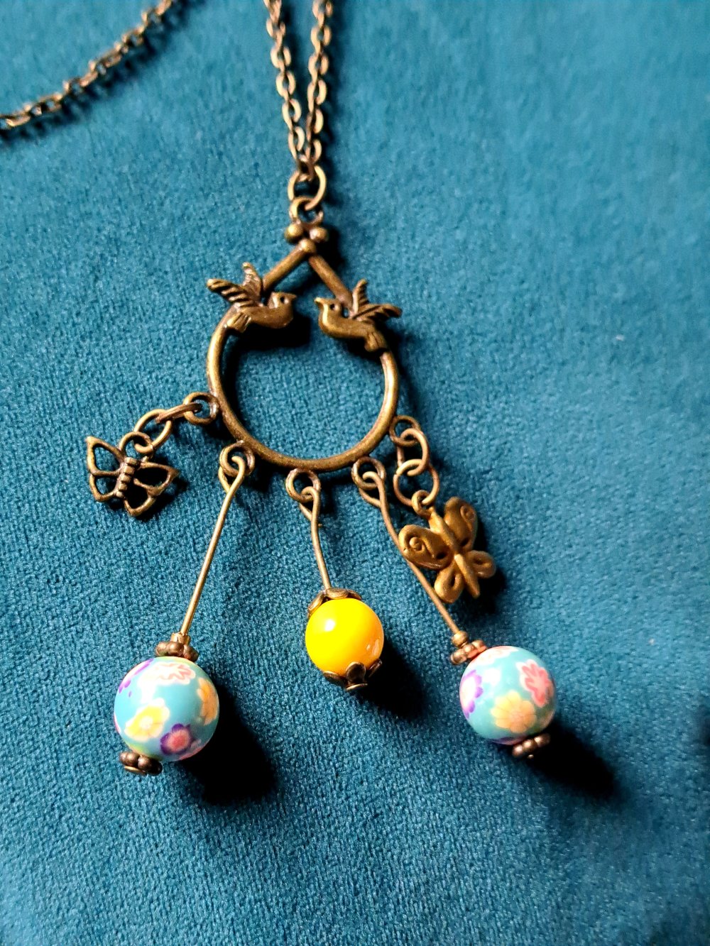 sautoirs, collier papillon, oiseaux, perles en acrylique, bleu à fleurs, jaune, chaîne en métal bronze