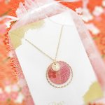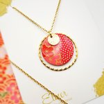 🌸✨ Le collier mi-long TAE 🌸✨ en acier inoxydable doré séduit par son pendentif rond en papier washi japonais, protégé par une fine résine et entouré d’un anneau doré martelé qui lui apporte relief et éclat.