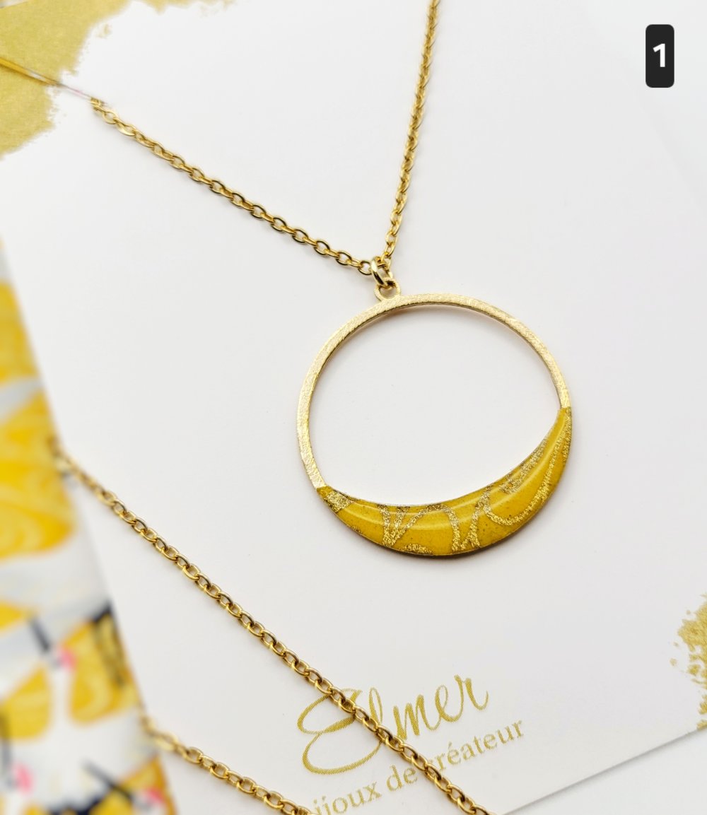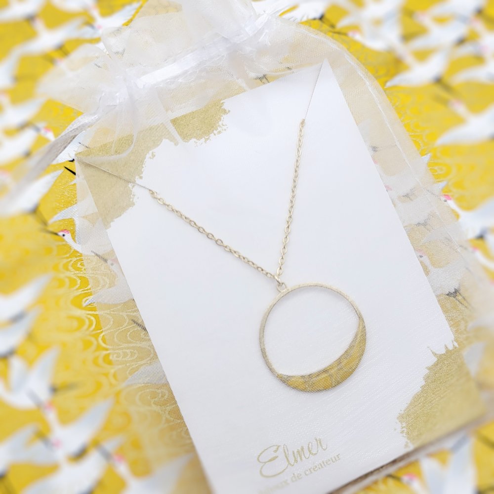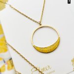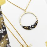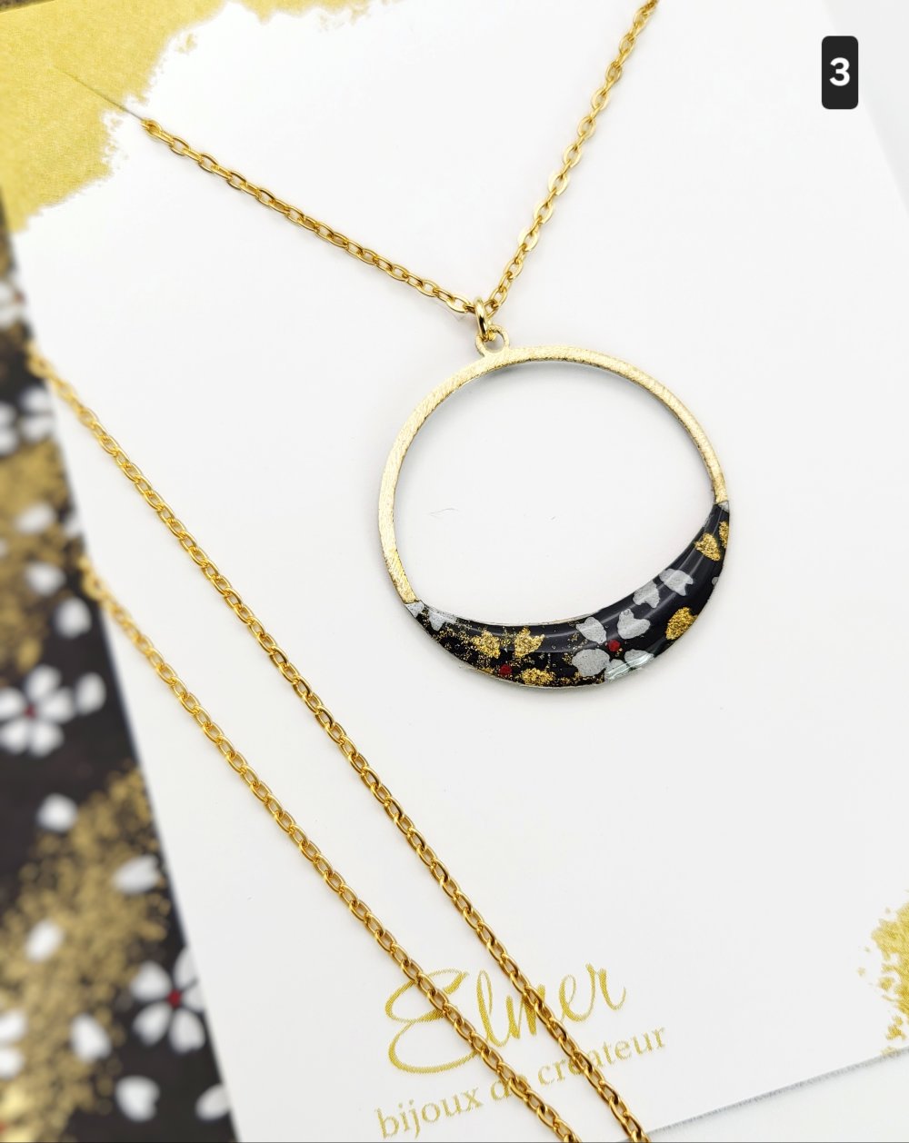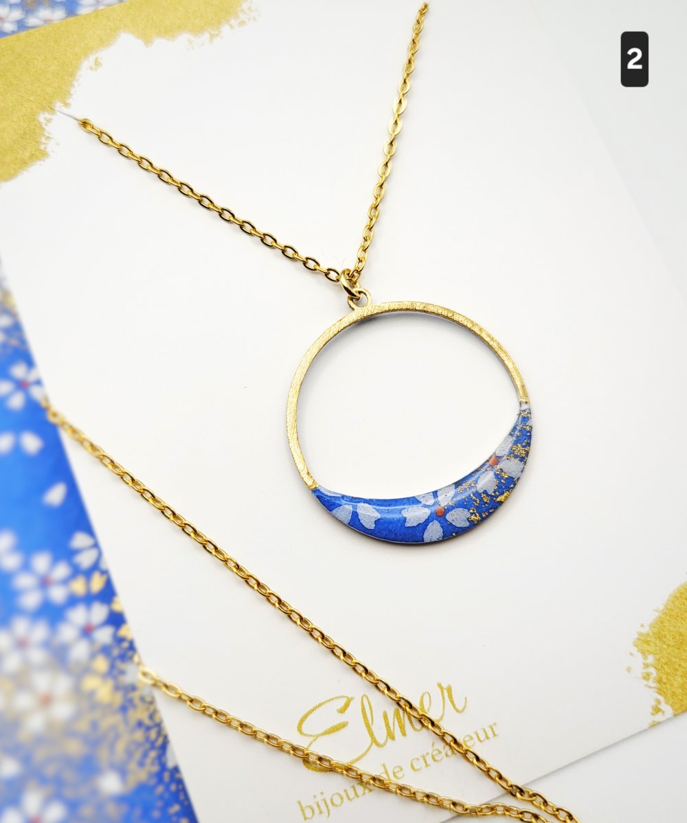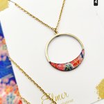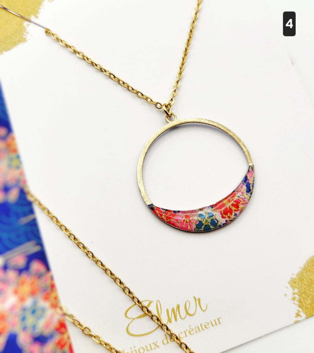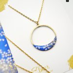 🌸✨ Le collier mi-long URA 🌸✨ en acier inoxydable doré séduit par son pendentif rond en papier washi japonais, protégé par une fine résine.