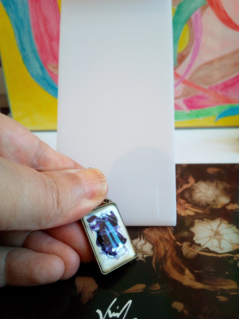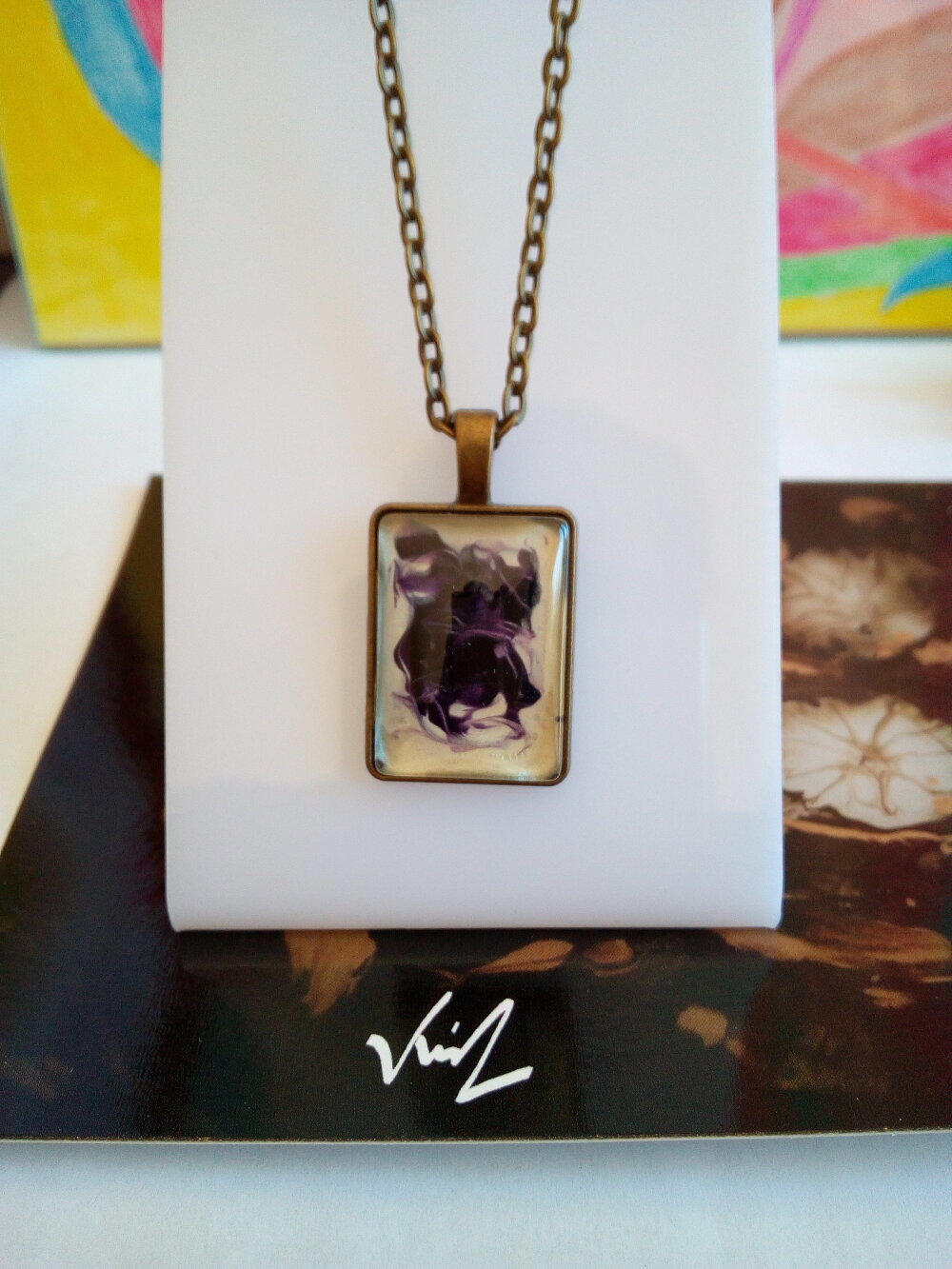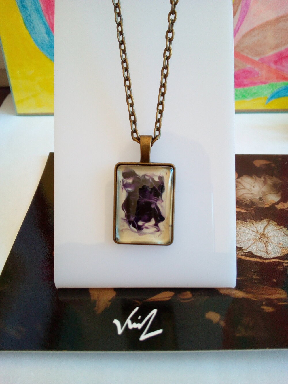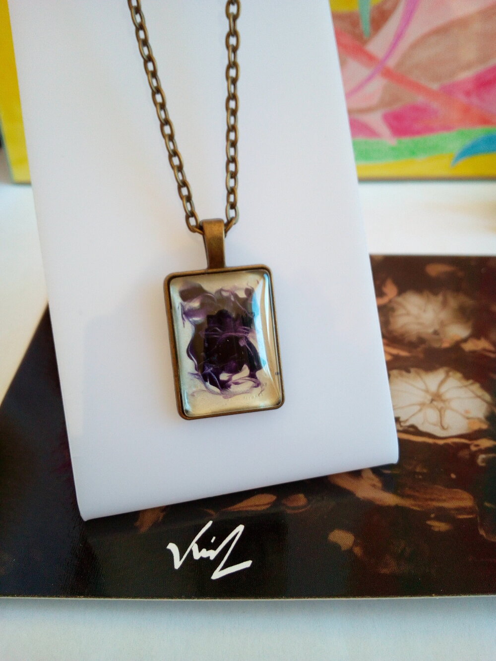 Verre peint,pendentif rectangulaire en laiton avec cabochon amethyste et nacre blanc,creation originale fait mains en france,chaine forçat