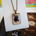 Verre peint,pendentif rectangulaire en laiton avec cabochon amethyste et nacre blanc,creation originale fait mains en france,chaine forçat,