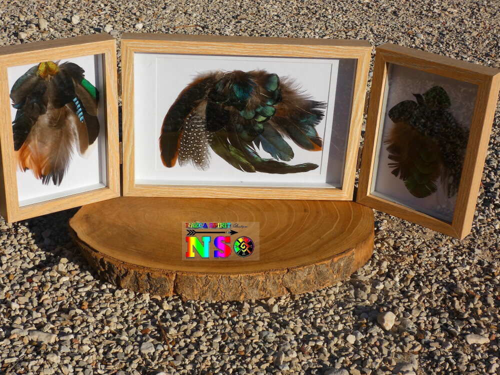 Composition Plumes Naturelles Rares de 50 cm ("19.68) de large à Poser - Tableau Triptyque Artisanal Décoration Maison - Plumes Iridescentes