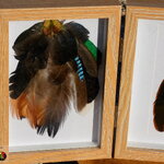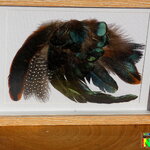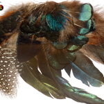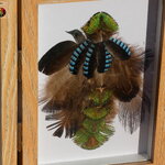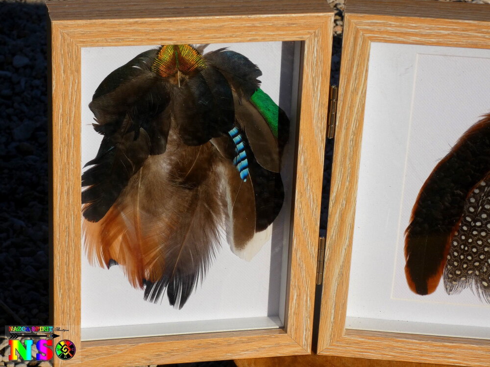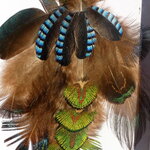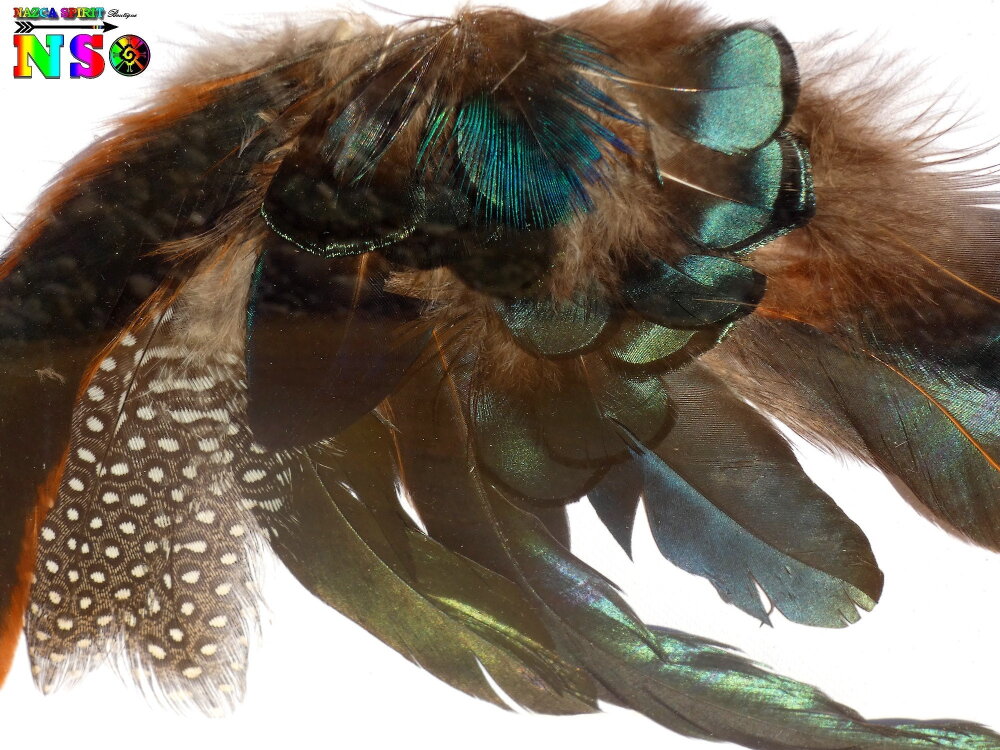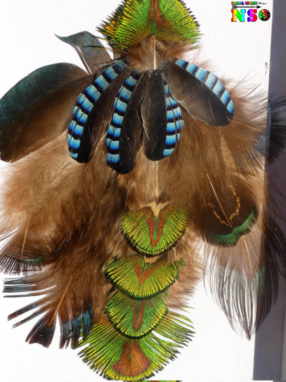 Plumes utilisées : plumes de geai des chênes, plumes de paon (vert iridescent), plume de paon saphir (bleu cobalt et turquoise iridescent), plume de faisan commun cuivré iridescent, plumes de faisan obscur (bleu iridescent), plumes de pintade mouchetée vulturine, plumes de pie noir iridescent, plumes de queue de coq irisé, plumes de canard colvert (bleu iridescent et vert iridescent),
