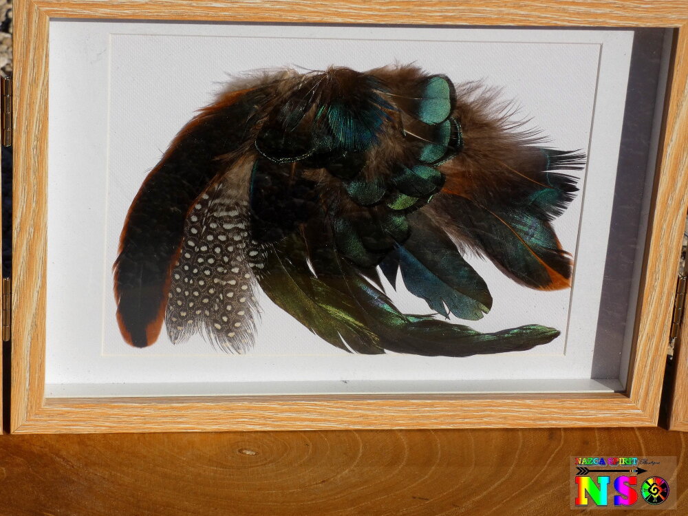 Les plumes qui composent cette composition sont des plumes d'espèces d'oiseaux communs de ma région et d'oiseaux plus rares : plumes de geai des chênes, plumes de paon (vert iridescent), plume de paon saphir (bleu cobalt et turquoise iridescent), plume de faisan commun cuivré iridescent, plumes de faisan obscur (bleu iridescent), plumes de pintade mouchetée vulturine, plumes de pie noir iridescent, plumes de queue de coq irisé, plumes de canard colvert (bleu iridescent et vert iridescent).