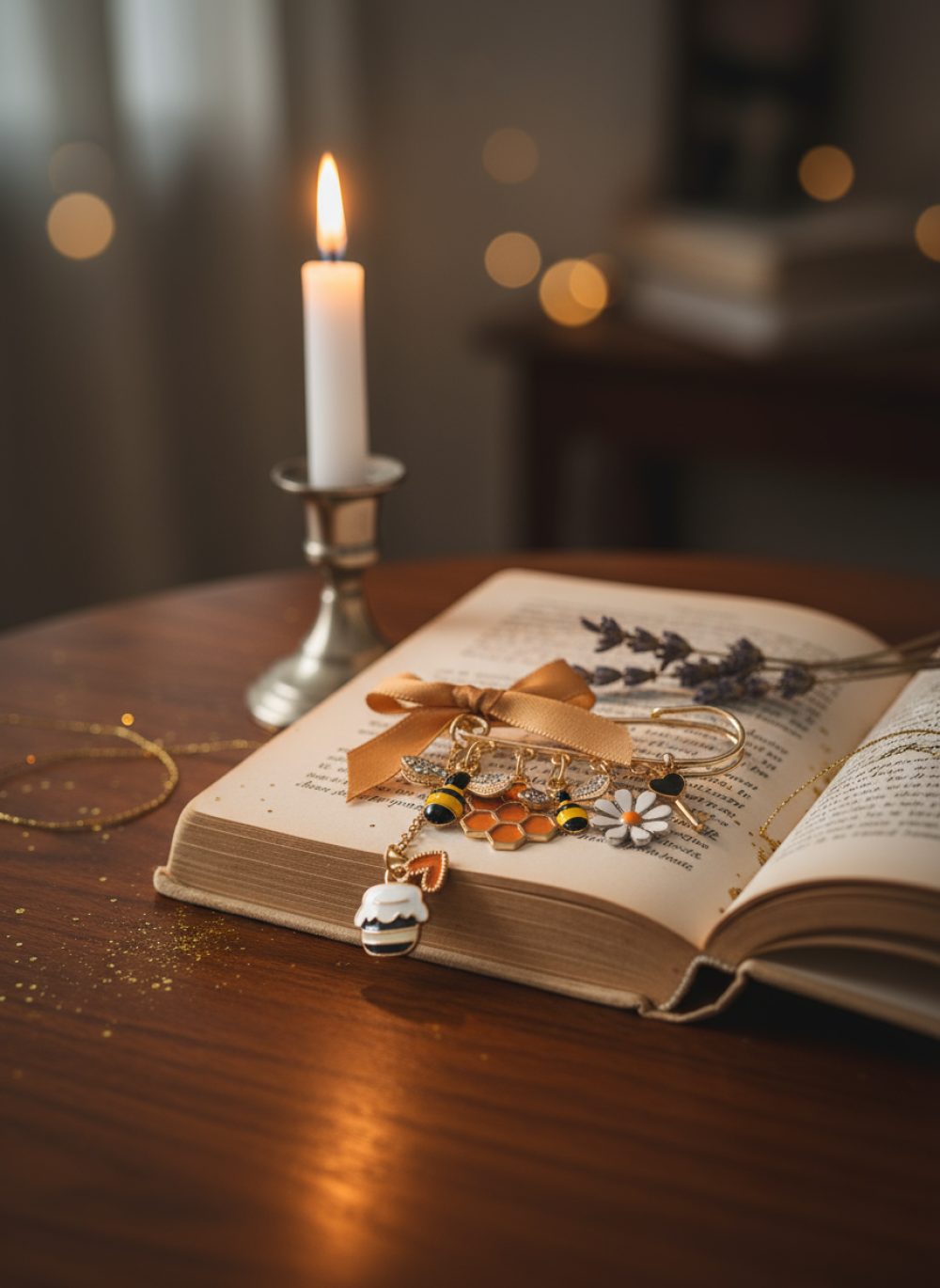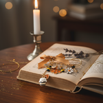 Façonnée à la main en acier inoxydable doré, ornée de breloques émaillées et d’un ruban satin, chaque broche est une pièce unique, née de mon atelier.