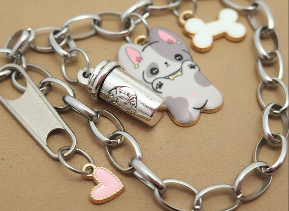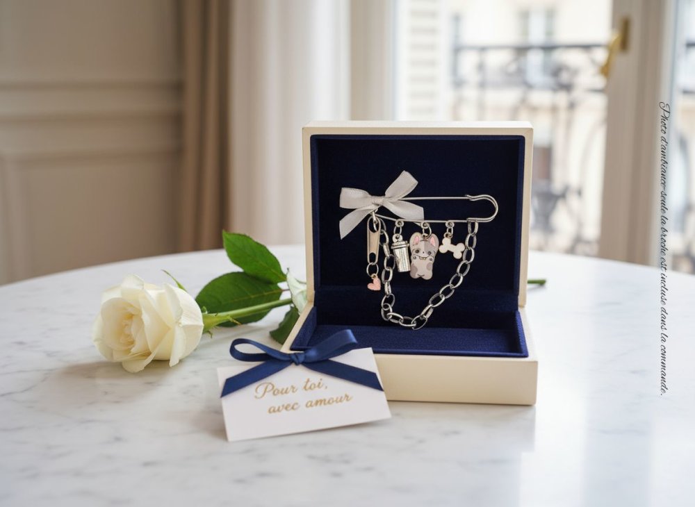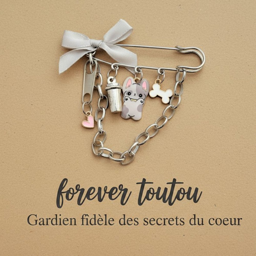Broche chien argentée “Forever Toutou” – bijou poétique fait main, symbole d’amour et de complicité. Livrée dans sa boîte rose, prête à offrir.