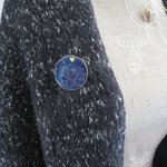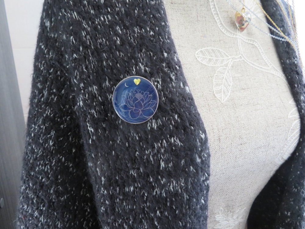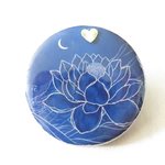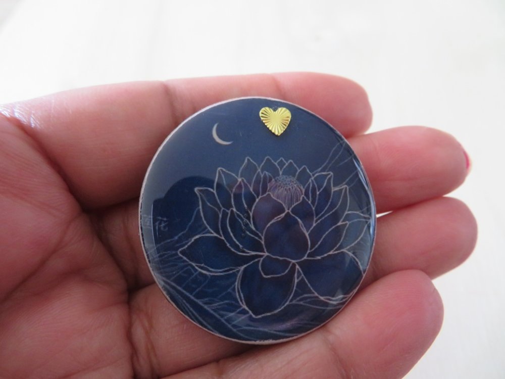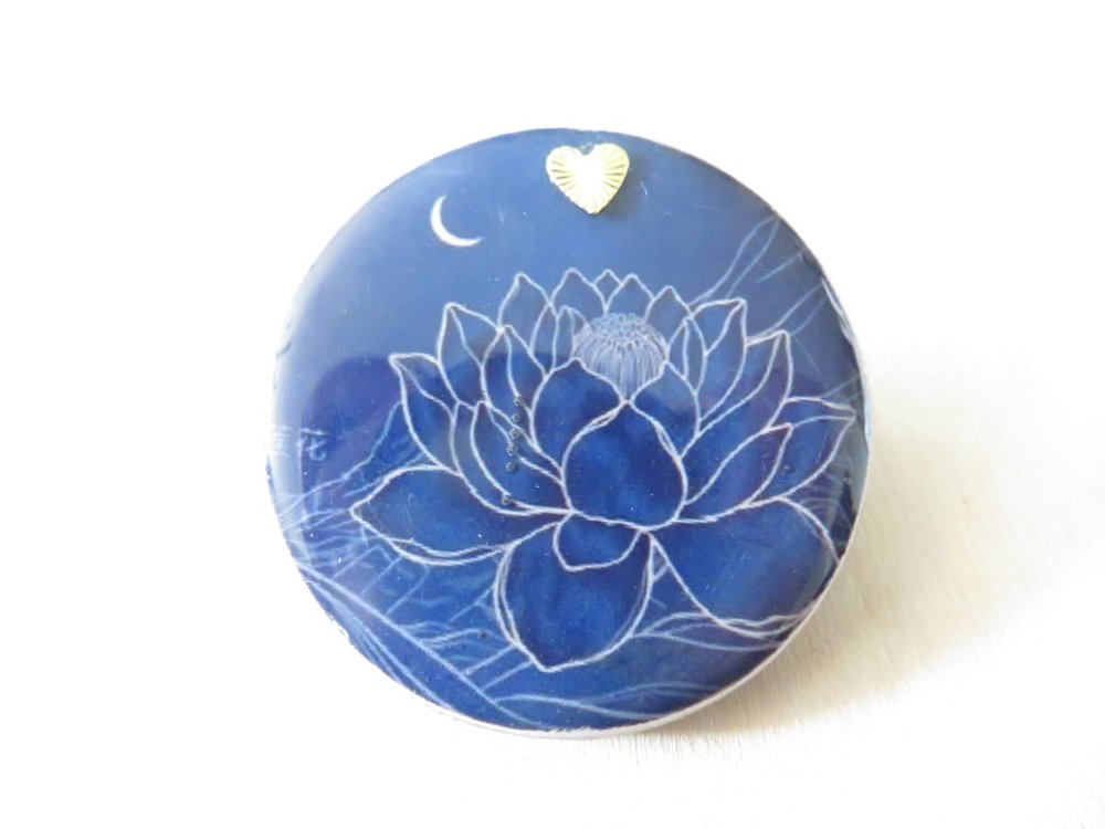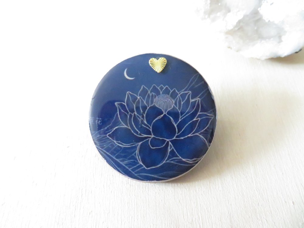 Broche ronde en bois motif fleur de lotus bleu nuit