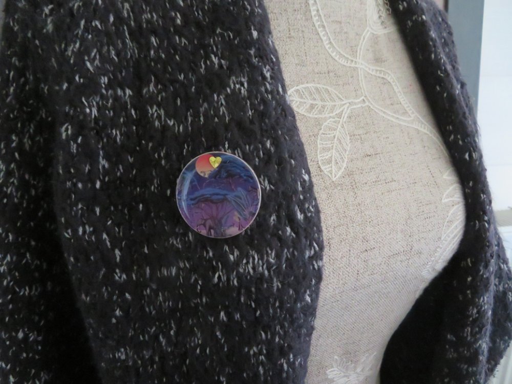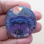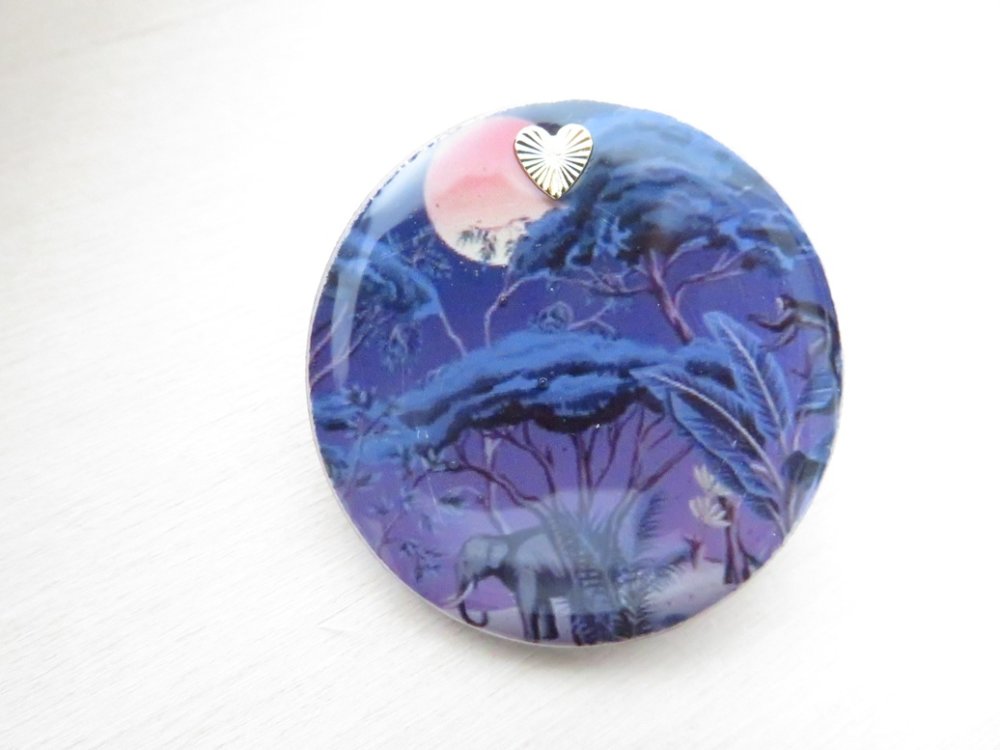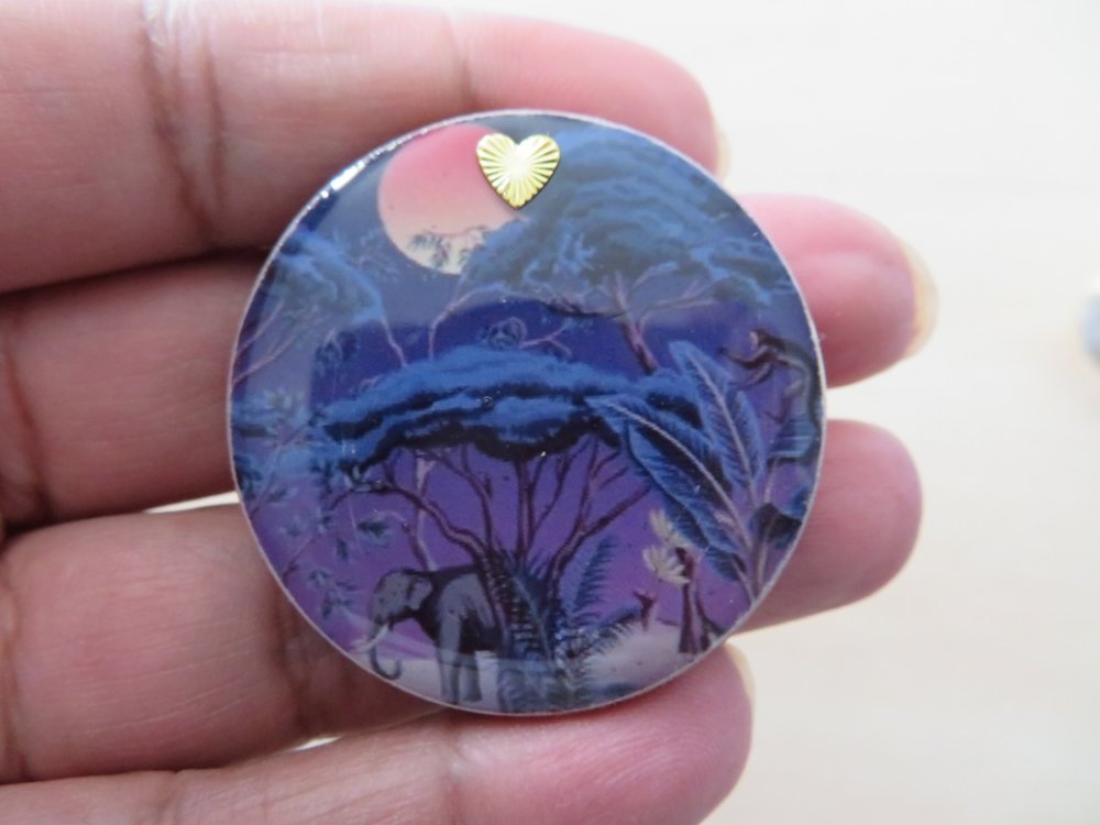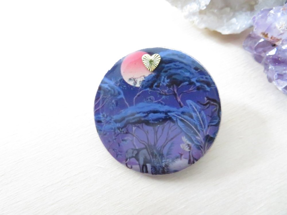 100% réalisé par mes soins, voici une belle broche faite en bois et résine avec un beau motif de paysage et éléphant. Cette broche ronde fait 40 mm de diamètre