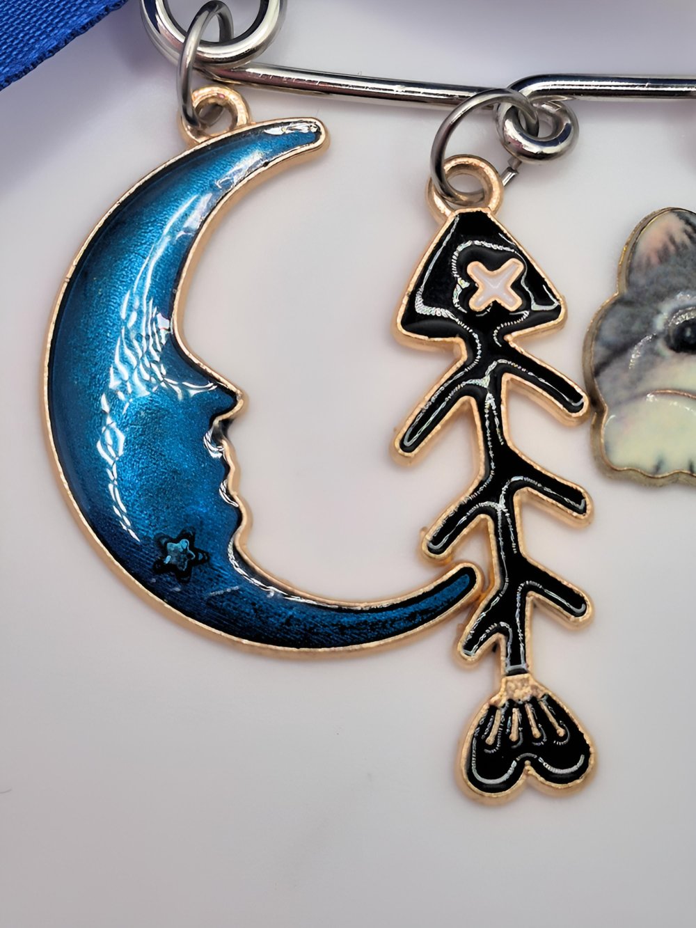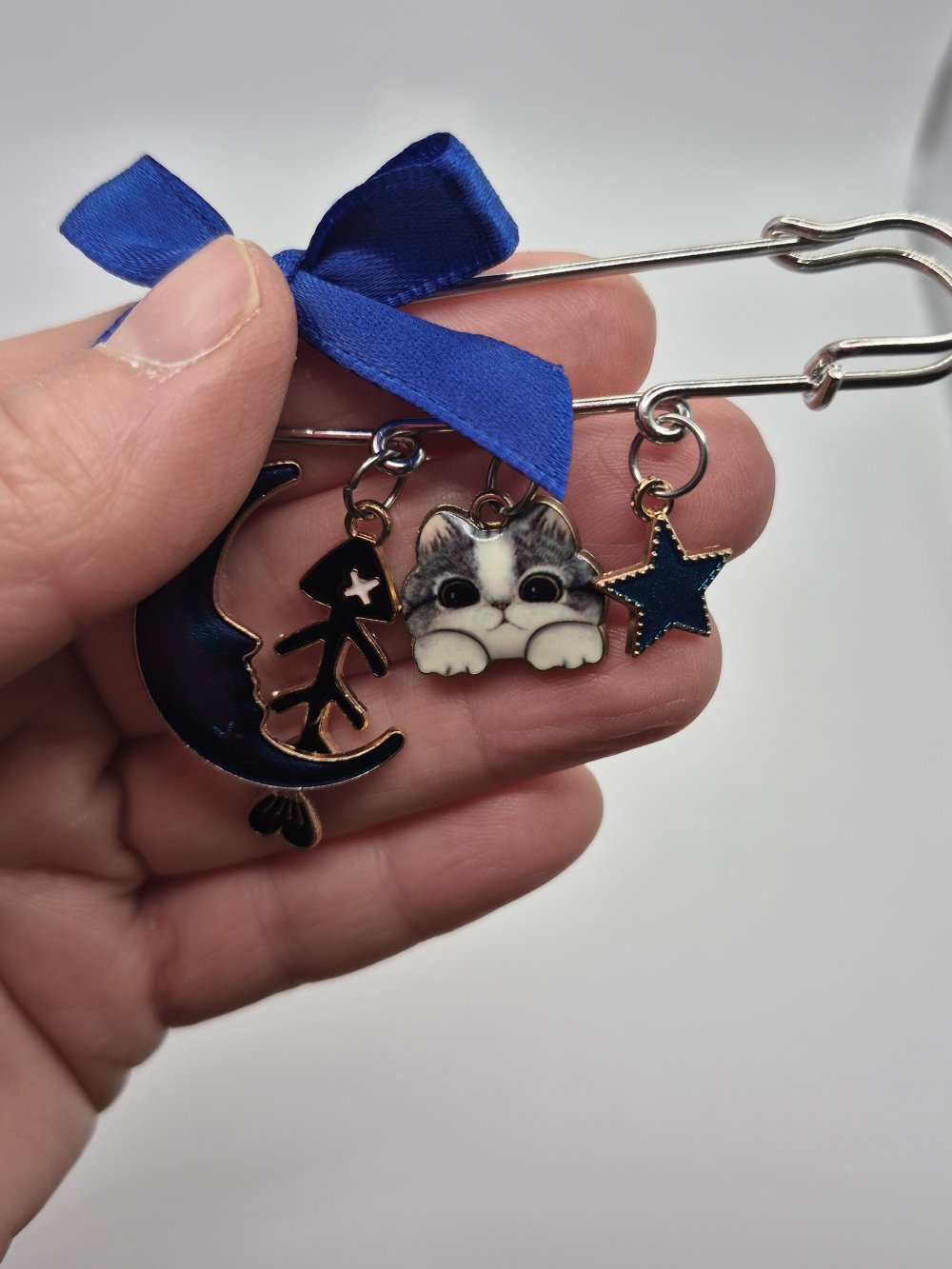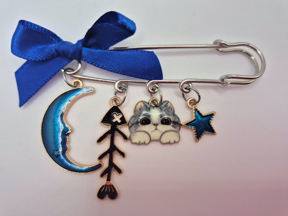 Retrouvez ma broche en vidéo ici :J’ai imaginé un chat gris perché sur un croissant de lune, guidé par les étoiles et porteur de secrets. Cette broche chat poétique de 6.5 cm, en métal doré avec breloques émaillées (chat, lune, étoile), est une création artisanale unique, jamais reproduite. Élégante et mystérieuse, elle se porte facilement sur une veste, un foulard ou un manteau.