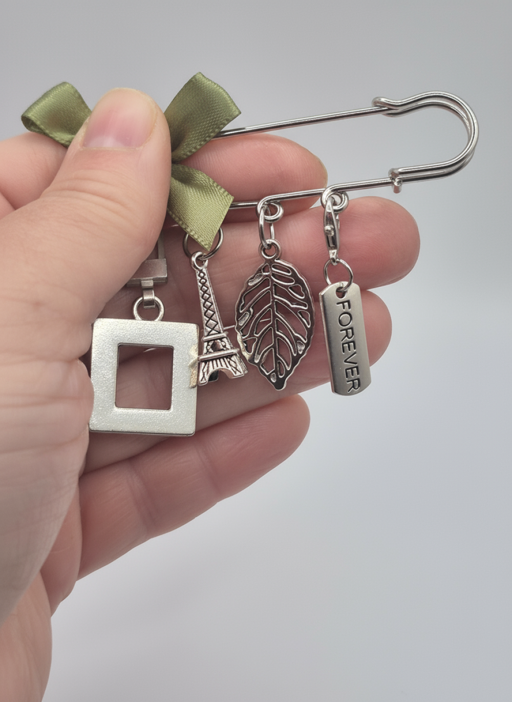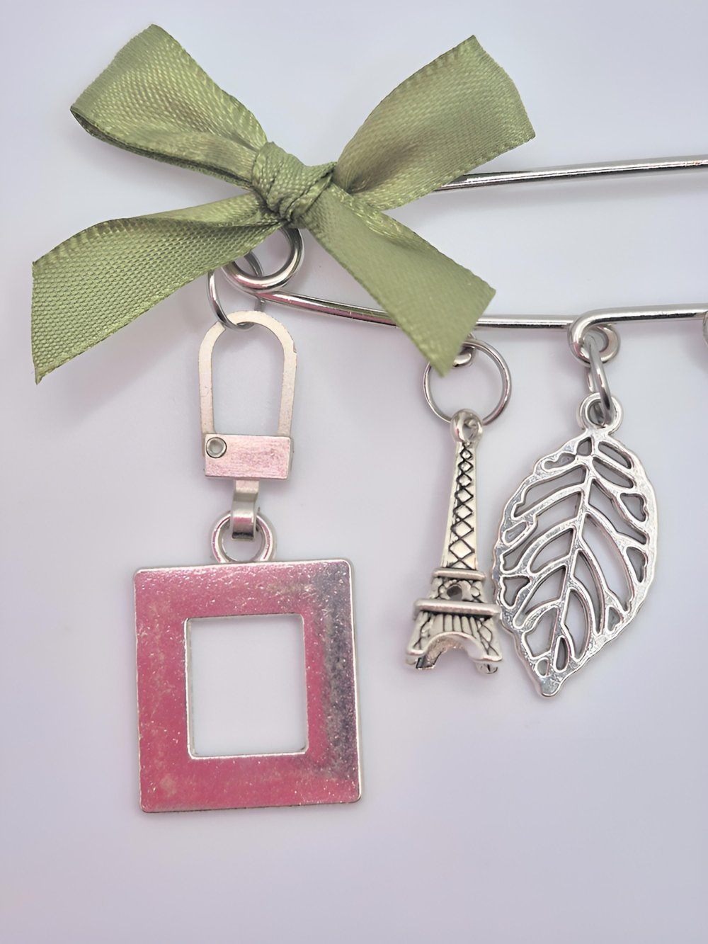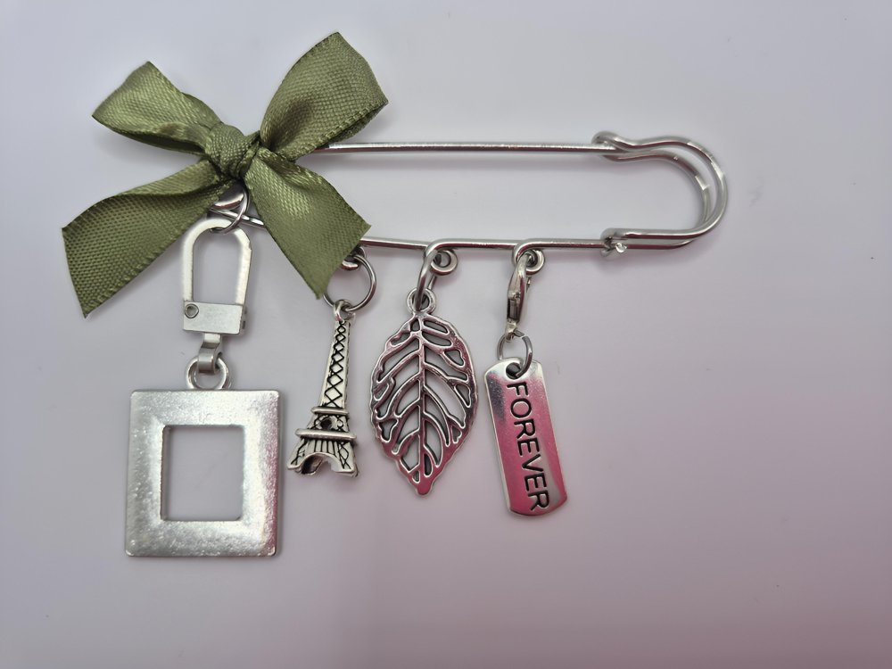 Retrouvez ma broche en vidéo ici :"Je vous présente ma broche Paris Forever : une épingle de 7 cm où chaque berloque raconte une histoire. La Tour Eiffel, promesse d’évasion et de romantisme. La feuille, symbole de légèreté et de renouveau. Le médaillon FOREVER, serment d’un lien éternel. Et le cadre vide, une fenêtre ouverte sur vos rêves. Nouée d’un ruban vert tendre, elle devient un bijou fantaisie unique, que je ne reproduirai jamais. Expédiée sous 24h gratuitement avec suivi, elle vous parviendra dans sa boîte lavande, accompagnée d’un petit cadeau. Plus qu’une broche, c’est un talisman poétique, un cadeau femme parfait pour garder Paris et l’éternité tout près du cœur."