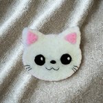 Cette broche en feutrine représente un chat blanc kawaii avec de grands yeux noirs et une bouche souriante..