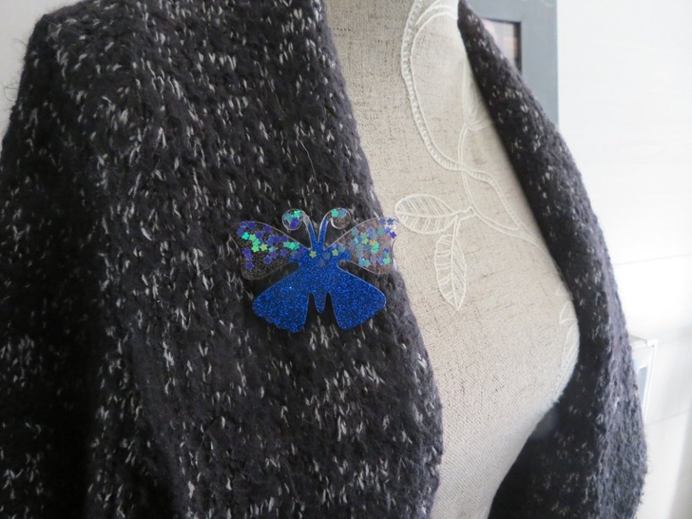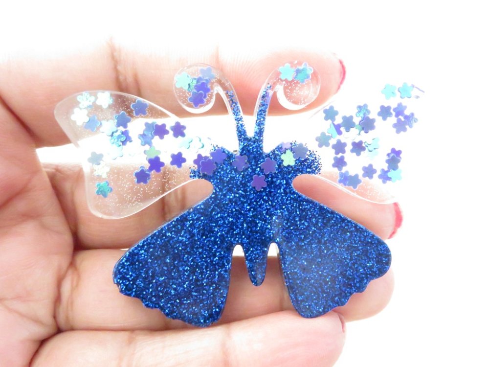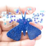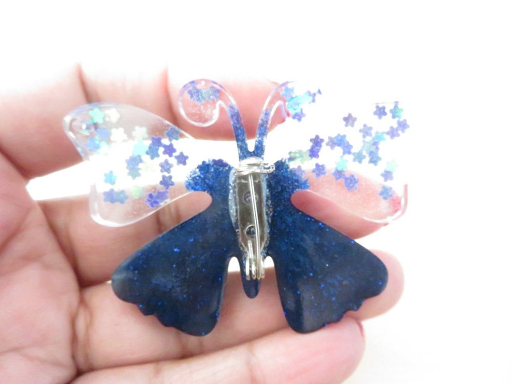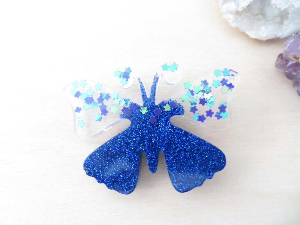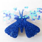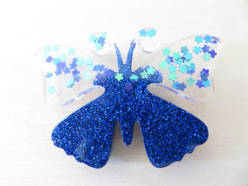 Broche papillon en résine paillettes bleu marine et petites fleurs