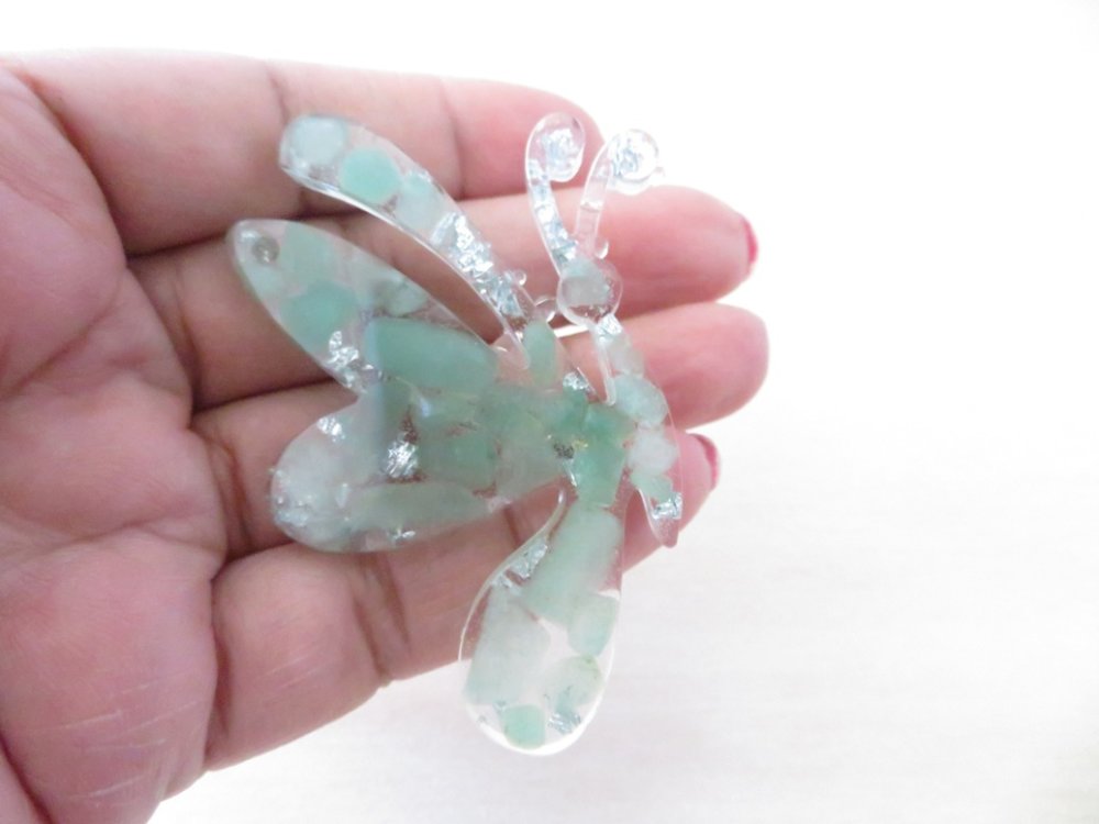 100% réalisé par mes soins, voici une belle broche « gros papillon » faite en résine et incrusté de pierres naturelles Aventurine verte (graviers) et flocons argent. Cette broche fait 70 x 43 mm