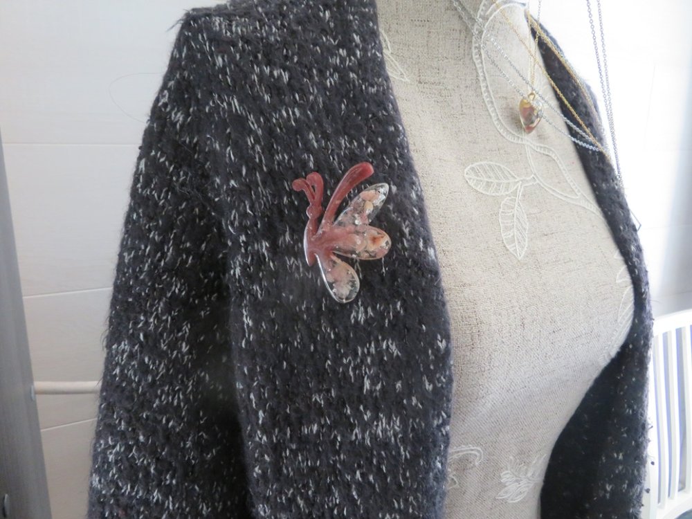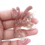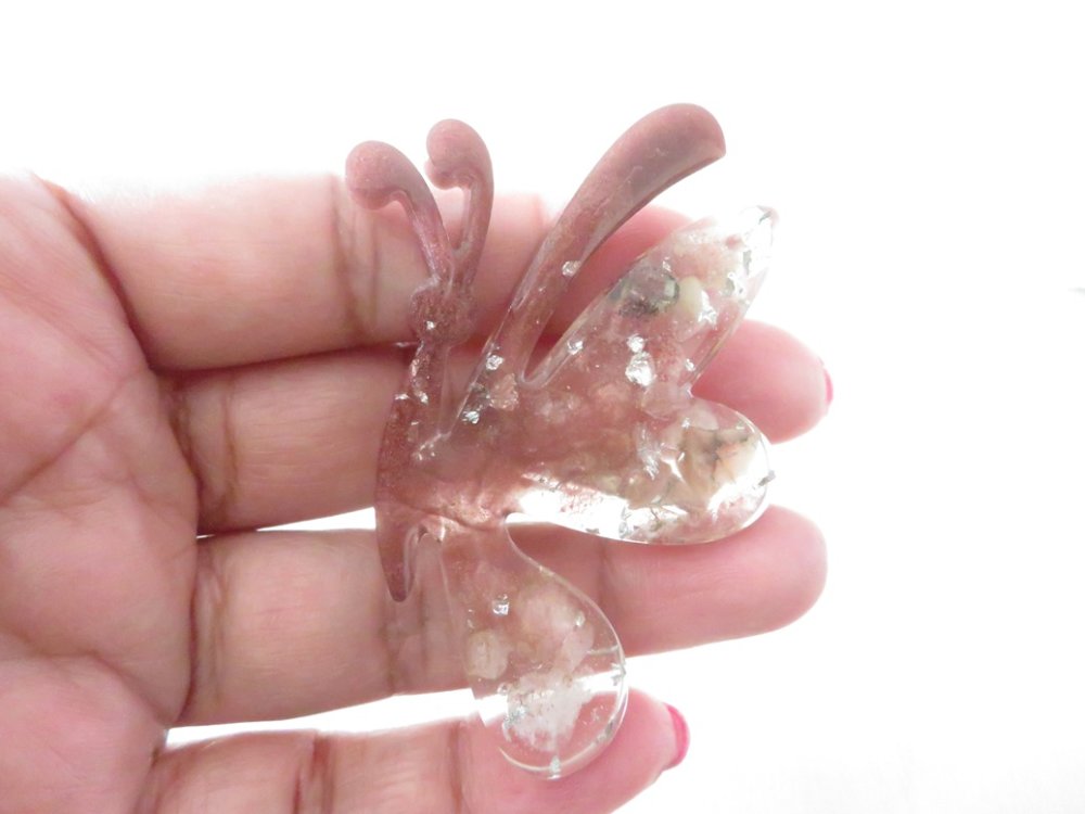 100% réalisé par mes soins, voici une belle broche « gros papillon » faite en résine et incrusté de pierres naturelles Quartz framboise (graviers) et flocons argent. Cette broche fait 70 x 43 mm