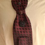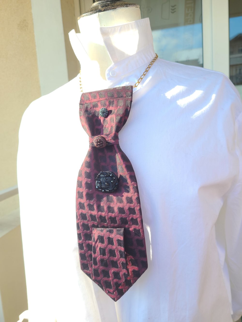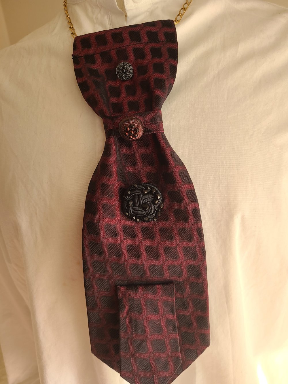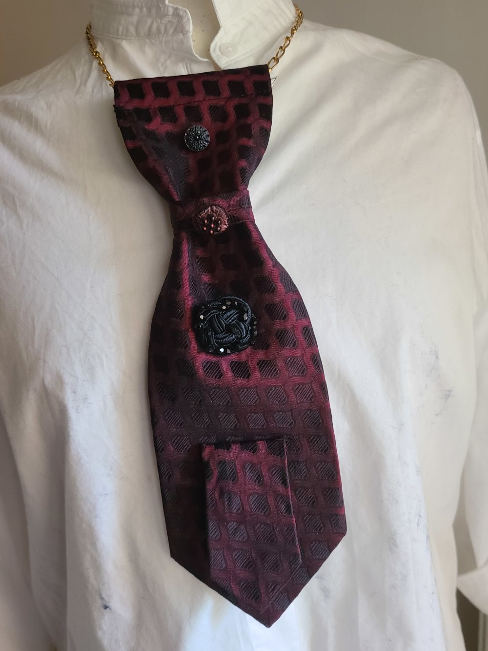 Un collier upcycling cravate. il est composé d'une cravate, de trois jolies boutons vintage et d'une chaine plaqué or.
