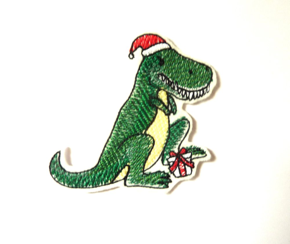 Appliqué, écusson, patch thermocollant, badge, dinosaure avec son chapeau de noël et un cadeau, prêt à thermocoller.