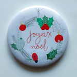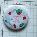 Badge de 75 mm image thème Noël imprimée sur papier de qualité recouvert par un film transparent. Dos en plastique blanc.