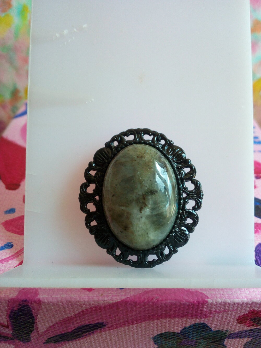 Labradorite,broche laiton noir fleurie fermoir epingle avec cabochon oval 18x25mm, camé de pierre precieuse,quartz gris bleute,cadeau fete