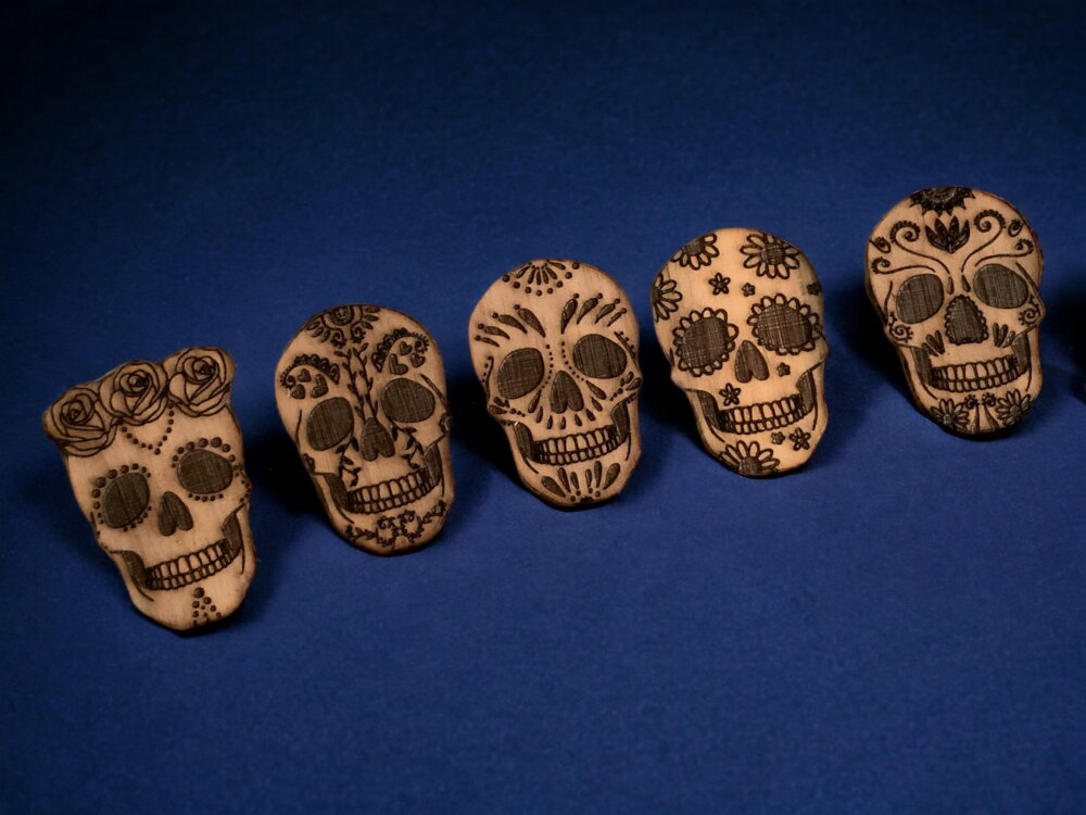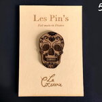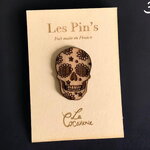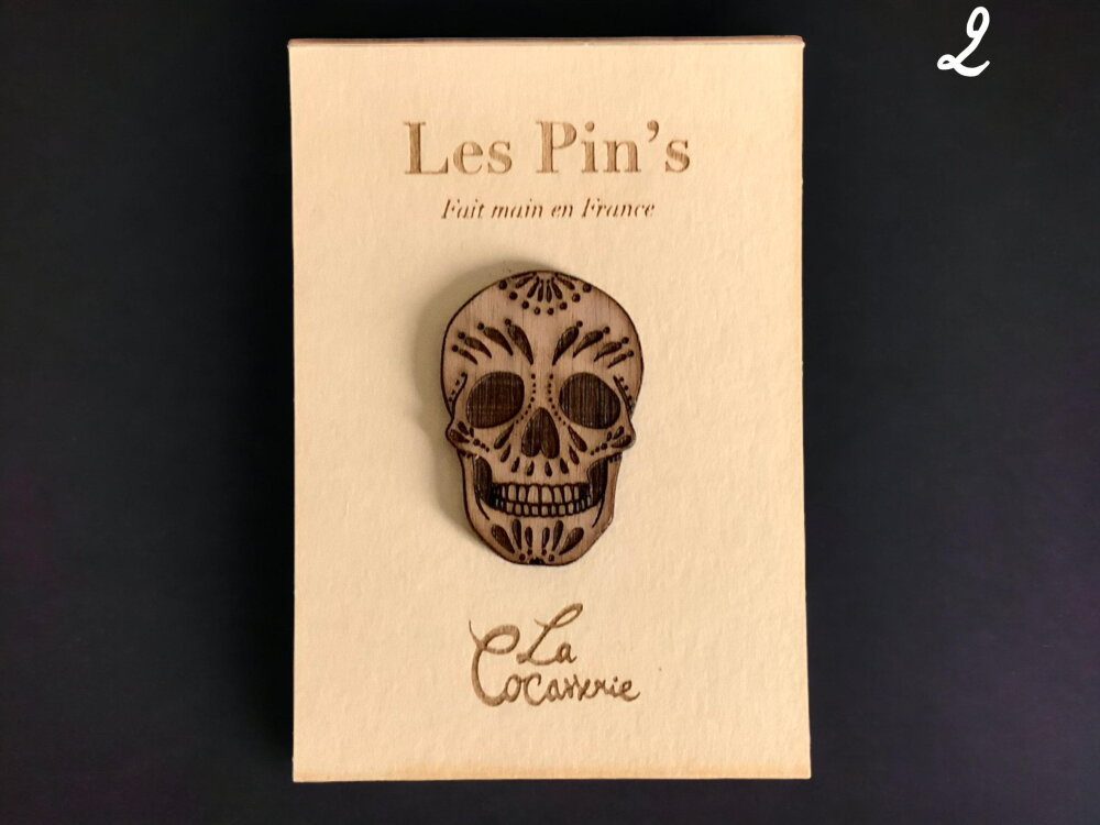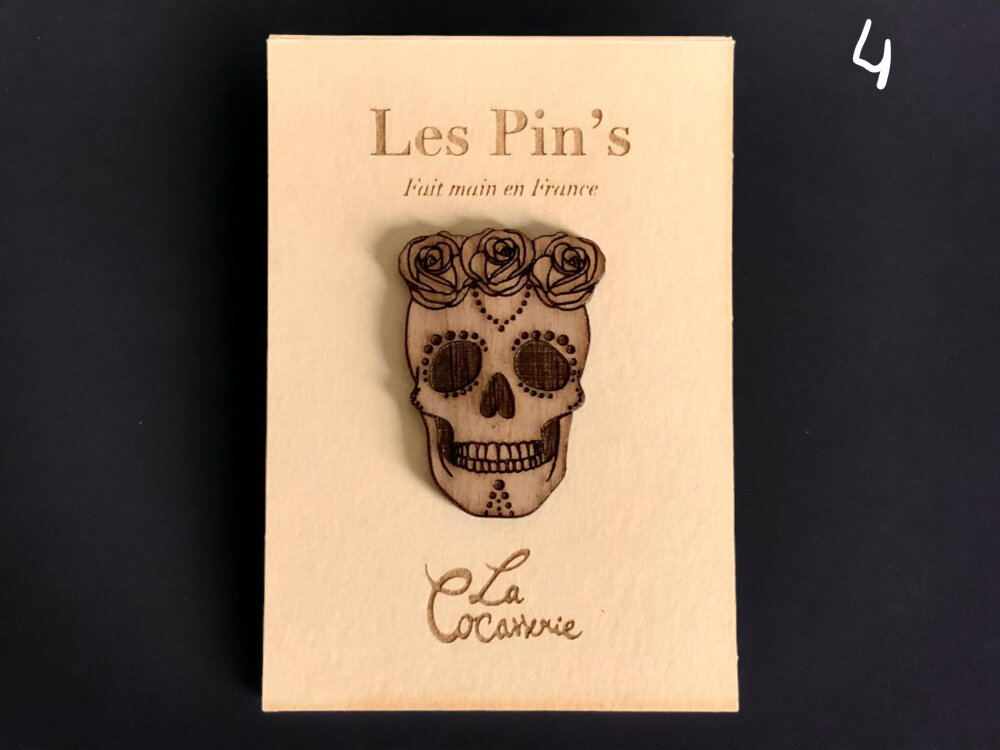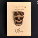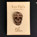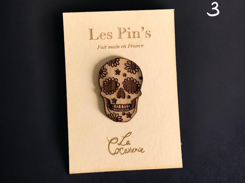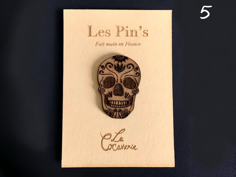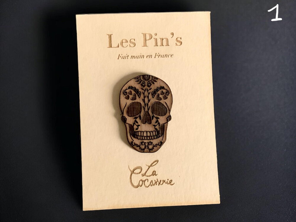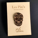 Pin's en bois de noyer crâne calaveras, tête de mort mexicaine (5 modèles) | Collection crâne | Fait main | Badge flower skull