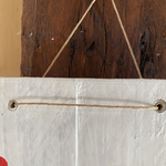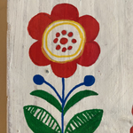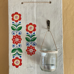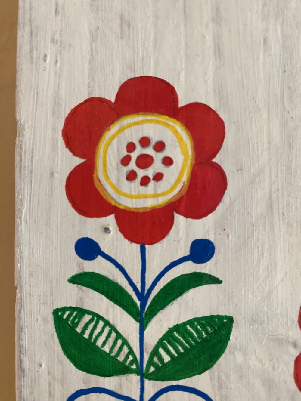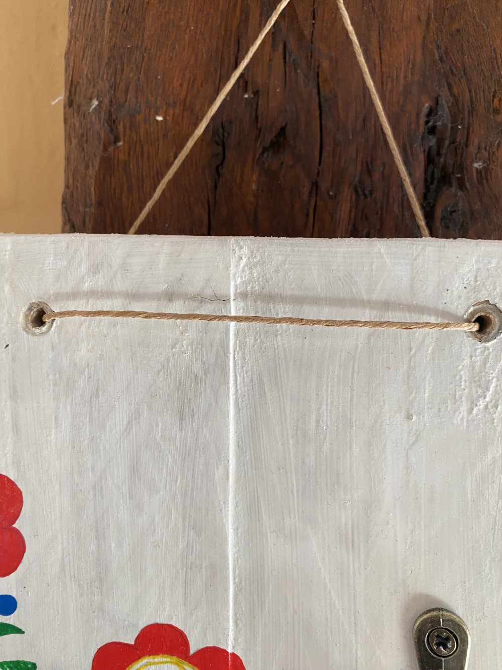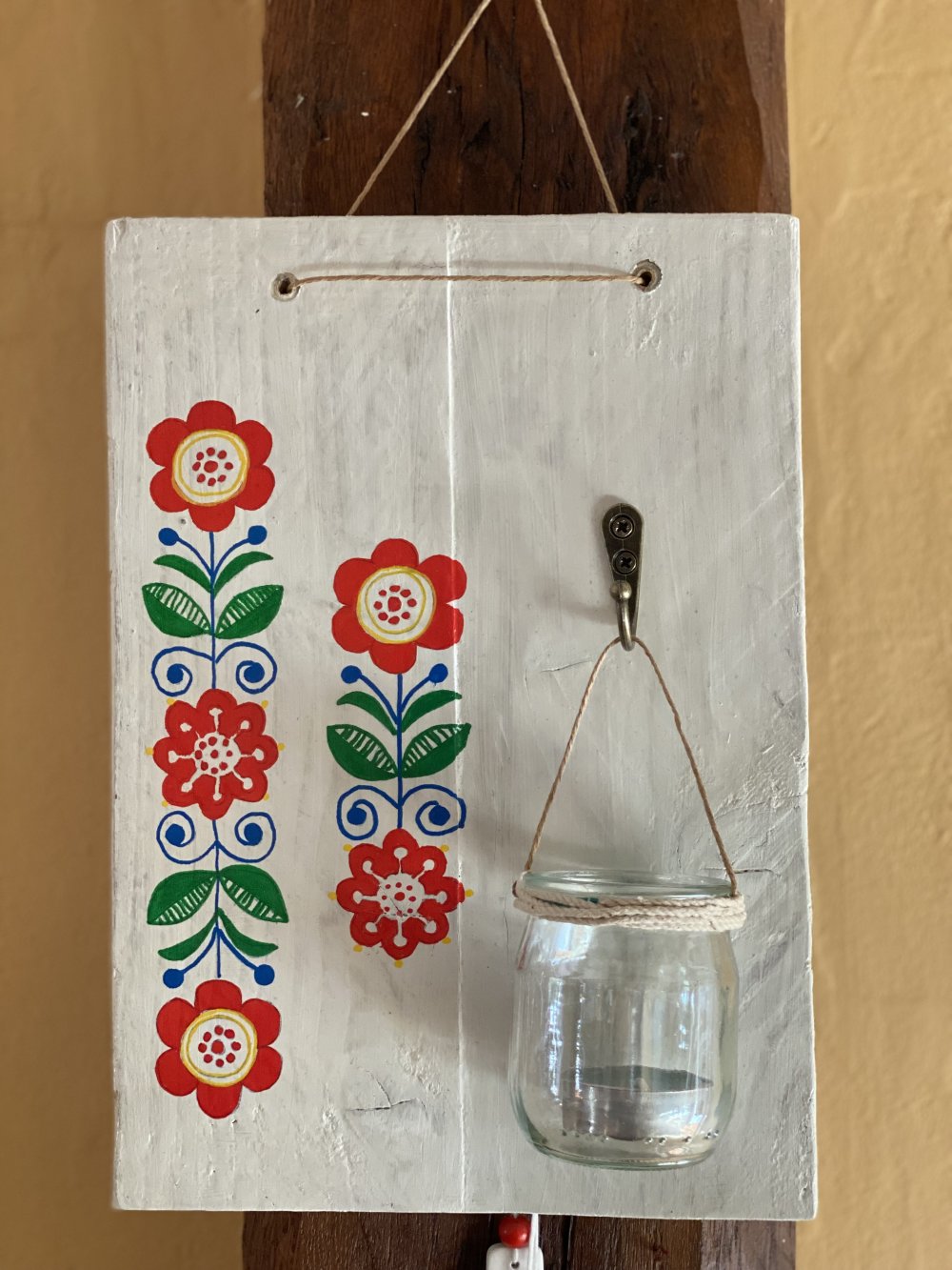 Pour faire cette accroche murale en bois, une planche à été découpée, poncée et peinte en blanc, rehaussée d’une frise en fleur, inspirée de motif folklorique…