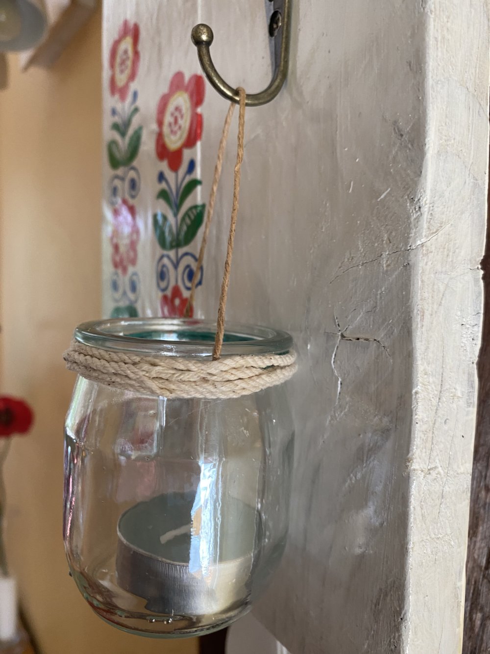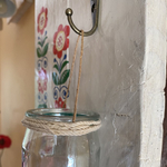 Un crochet où un petit pot en verre attendra un bouquet de fleurs ou une bougie (fournie avec)…