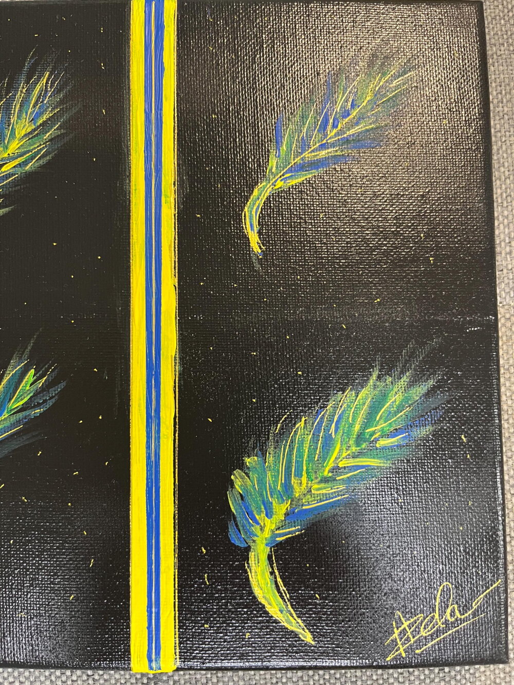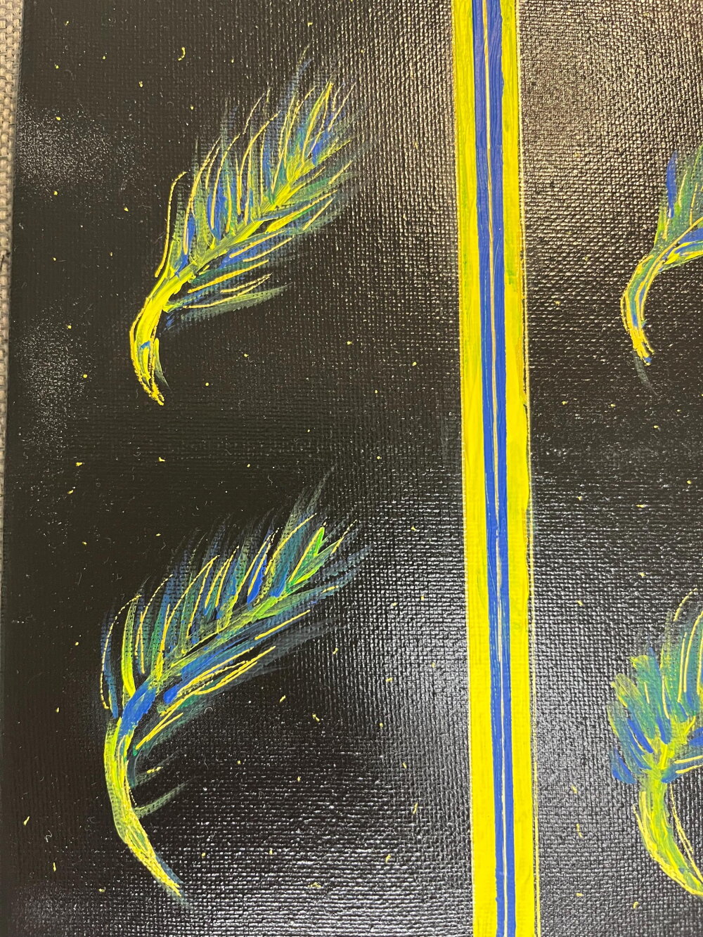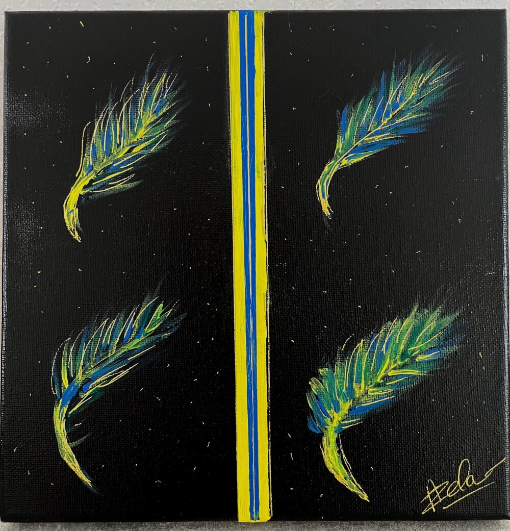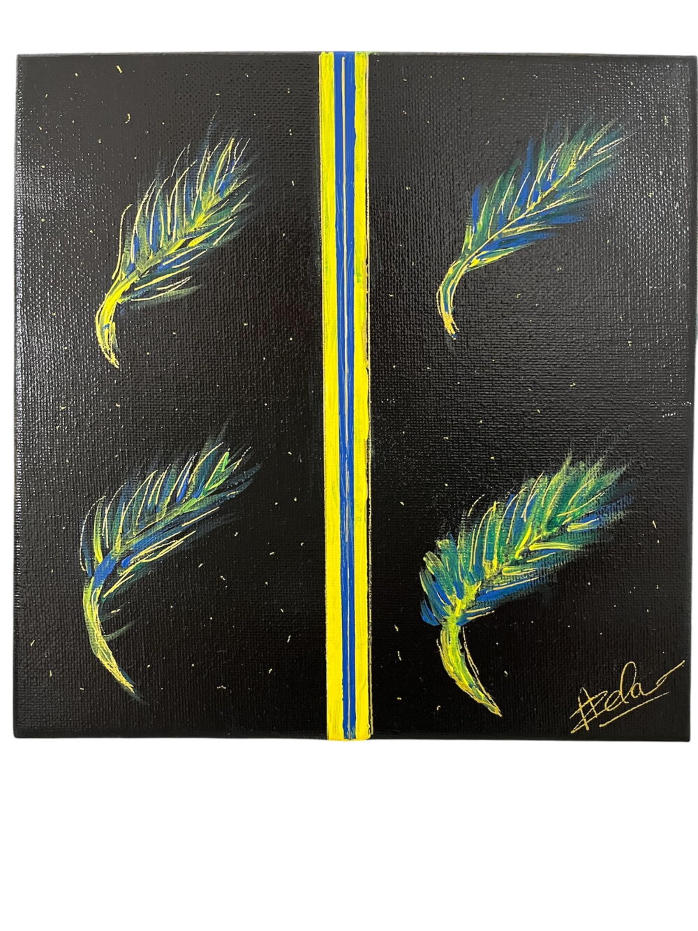 Des plumes lumineuses flottent sur un fond noir profond, séparées par une ligne vibrante de jaune et de bleu.