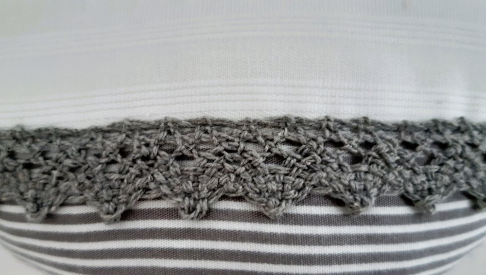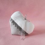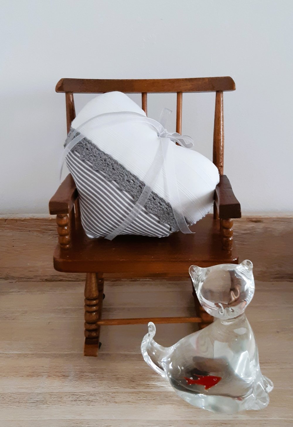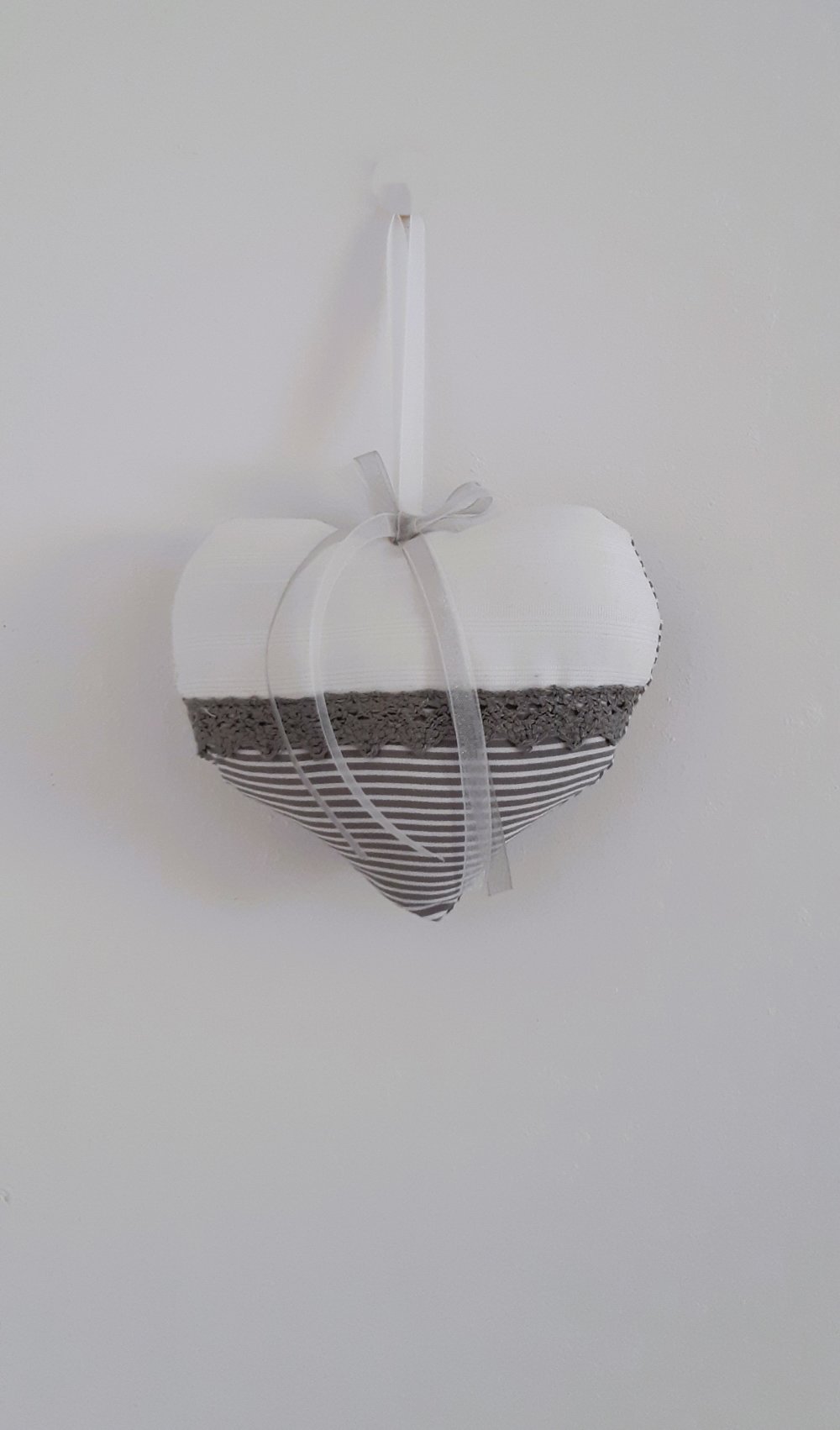 Élégance discrète pour votre intérieur. Ce cœur en coton rayé blanc et gris, rehaussé de dentelle, crée une ambiance douce et chic. Idéal pour une décoration murale cosy et raffinée