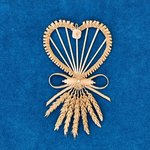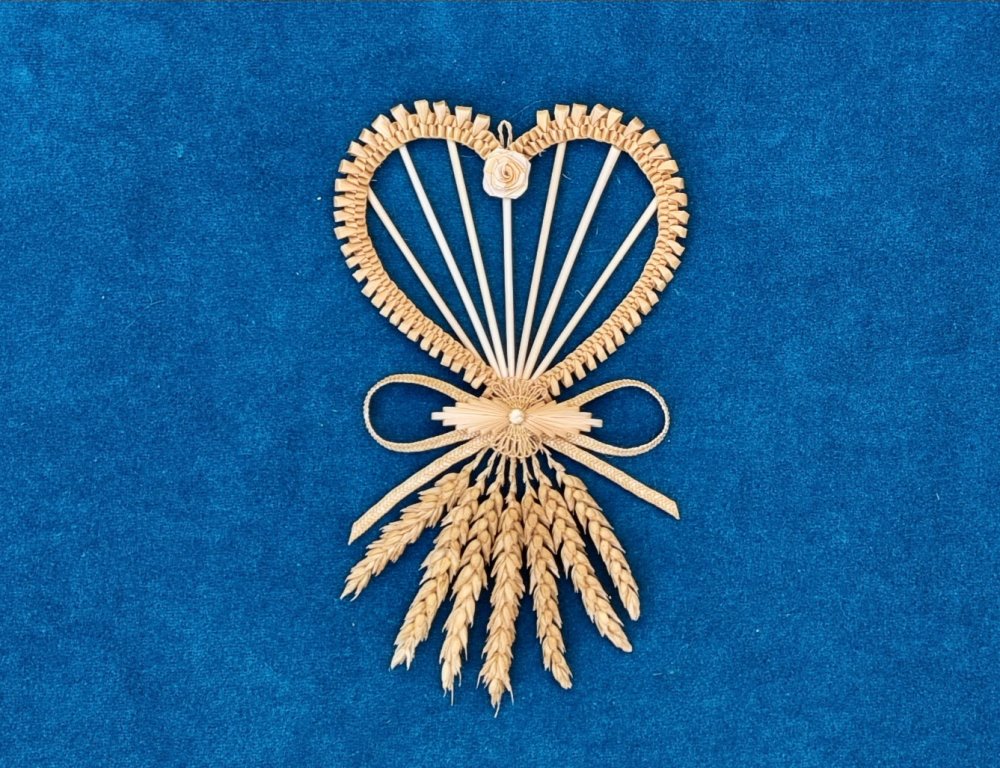 Porte-bonheur en forme de cœur avec 7 épis de blé, décoré avec des feuilles, bille et rose en blé fendu et un noeud en tortillons (fil en paille torsadé)