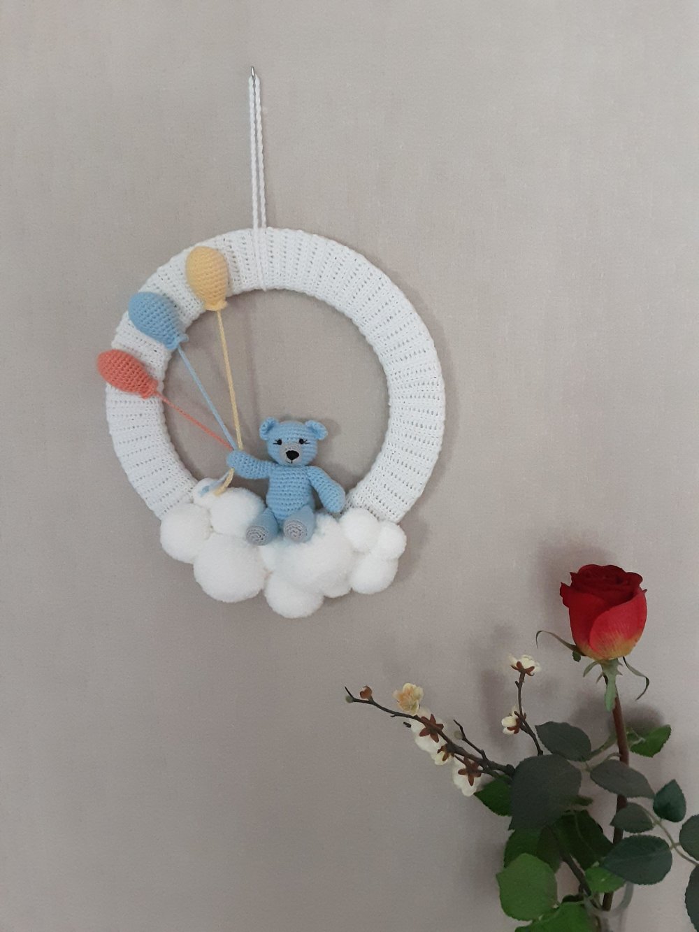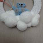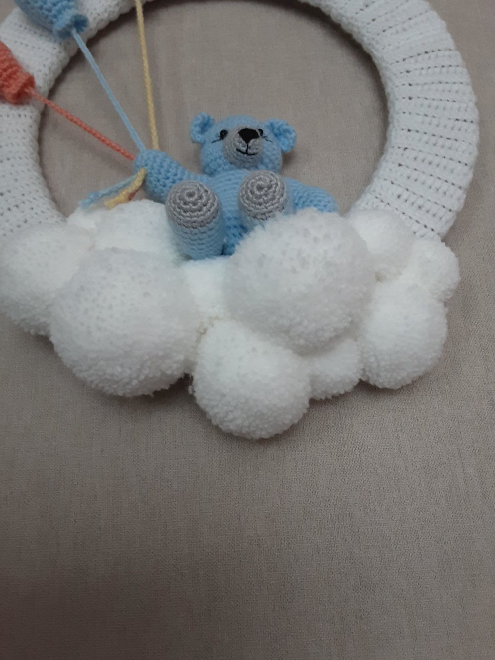 voici un petit ourson assis sur un nuage de pompon blancs ,il s'envole avec 3 ballons