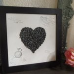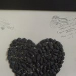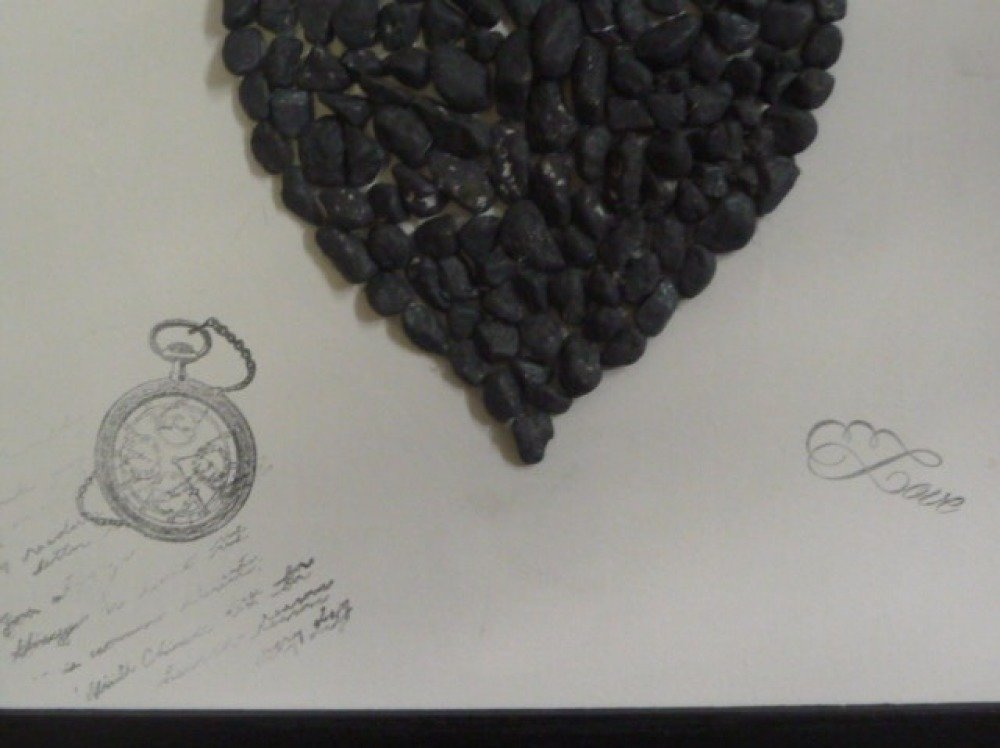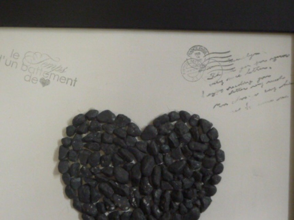 Joli tableau dont le cadre est peint en noir, le fond est blanc avec textes d'amour et un coeur en petites pierres gris foncé