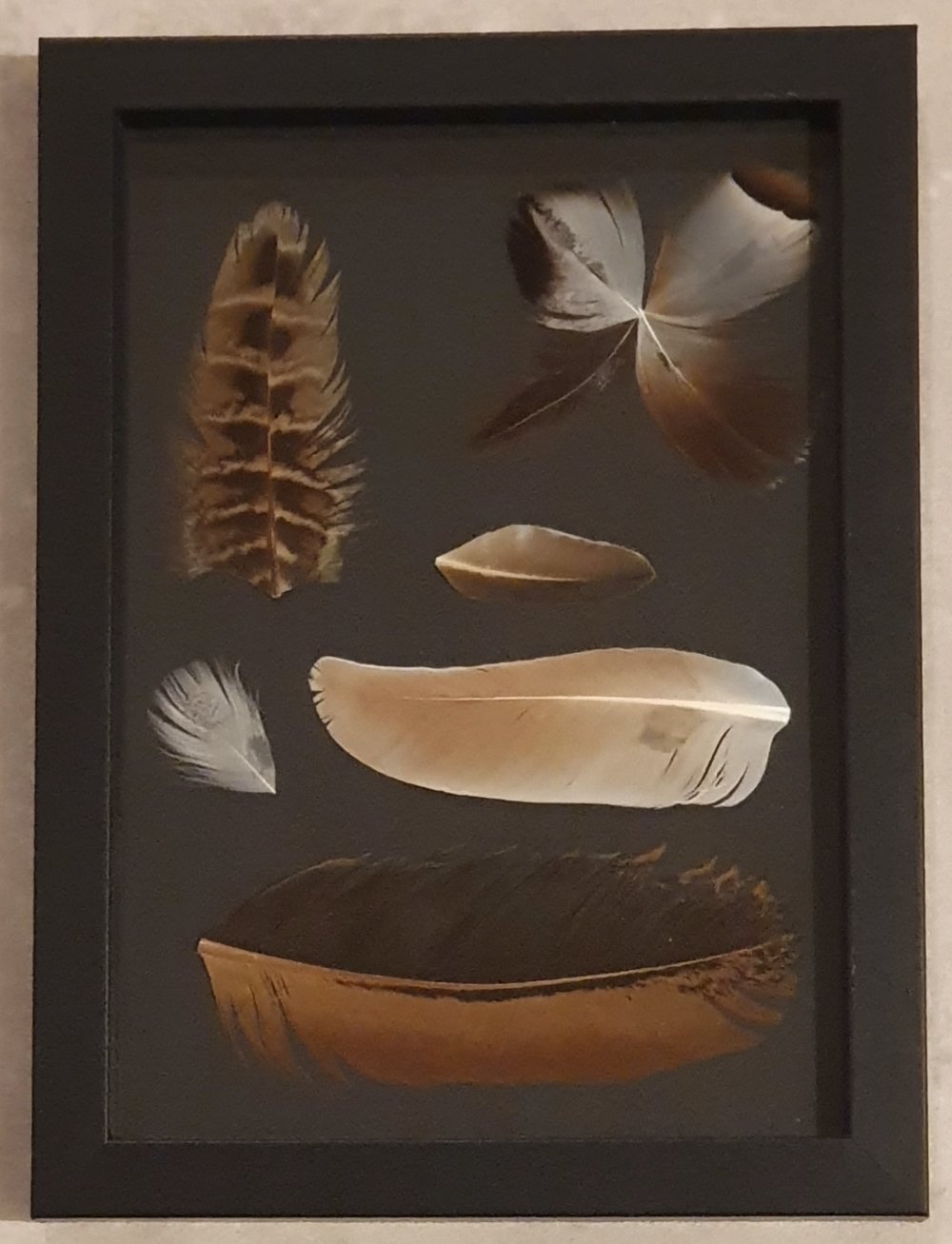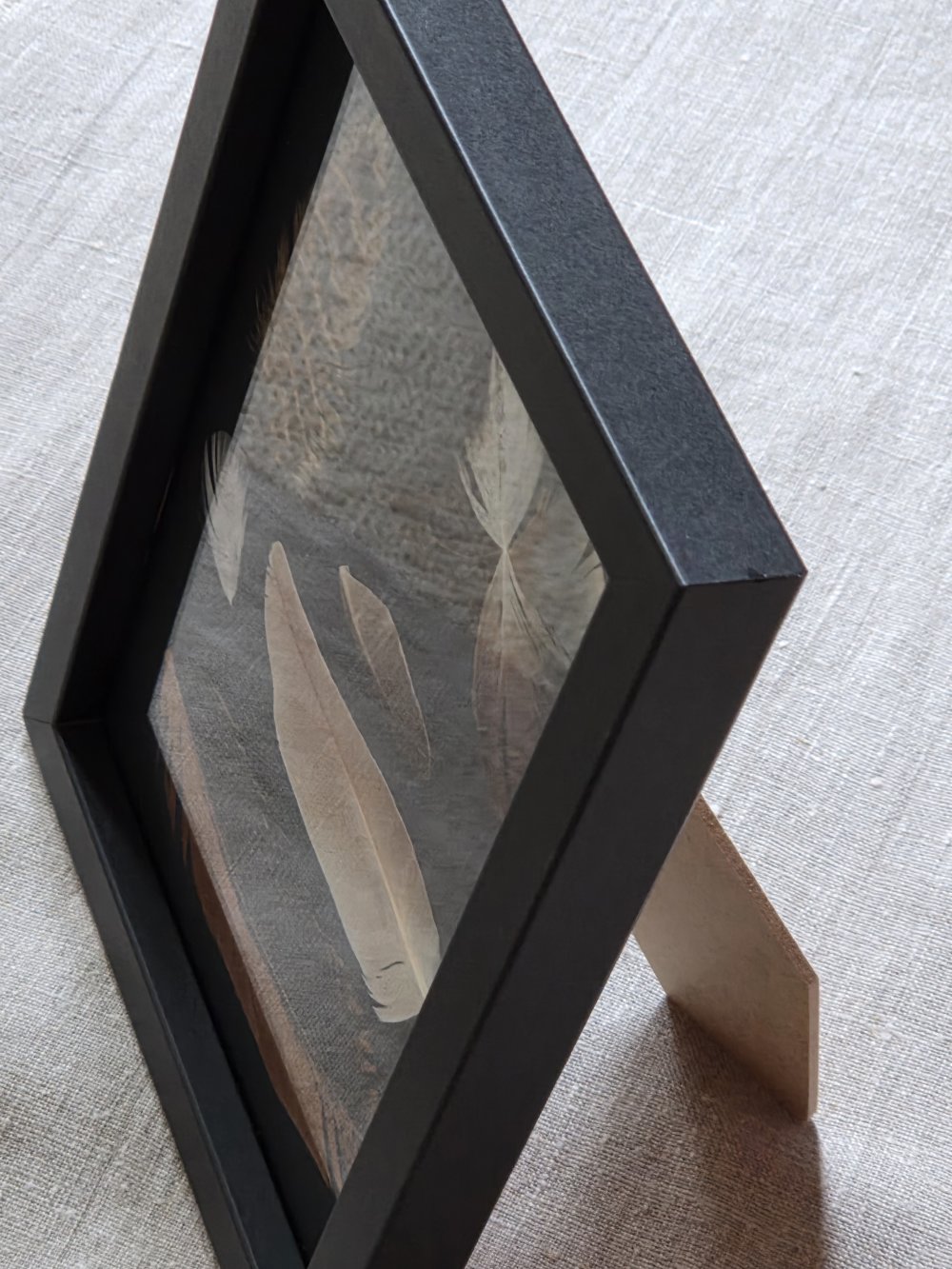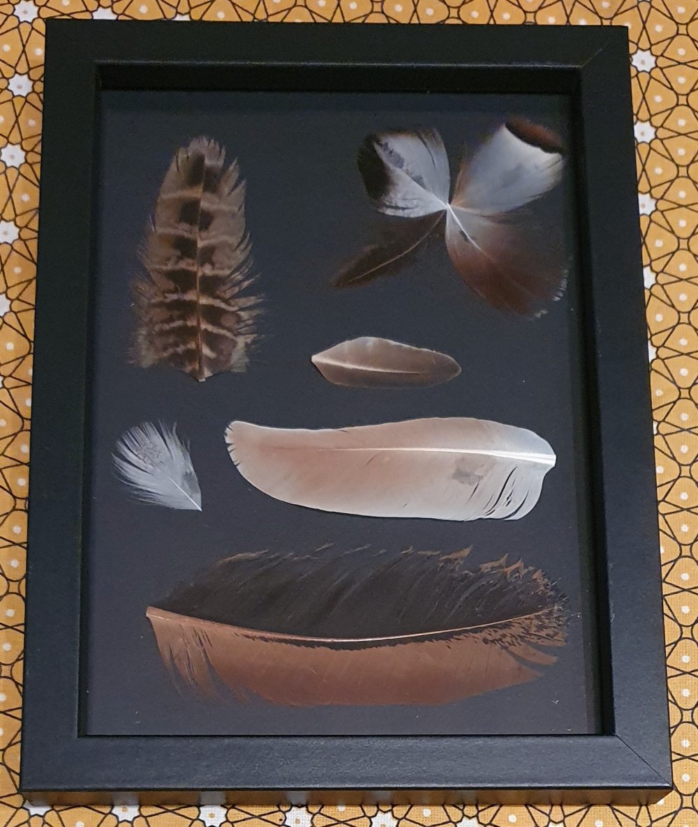 Le cadre en bois fait 2 cm d'épaisseur, les plumes sont sous verre.