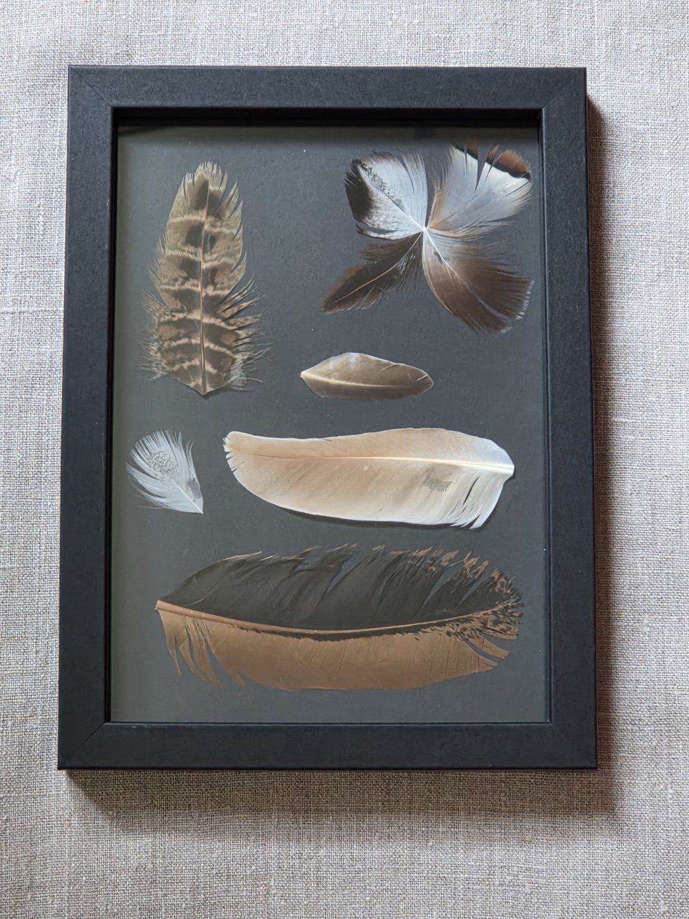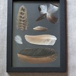 Récemment, j’ai eu envie de « mettre en scène » ces plumes d’oiseaux, sous forme de cadres décoratifs, en y intégrant parfois d’autres matériaux naturels. Parfois, je réalise moi-même l’encadrement. Chaque pièce est unique, créée au gré de mon imagination, de ma sensibilité et de mon inspiration du moment.