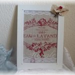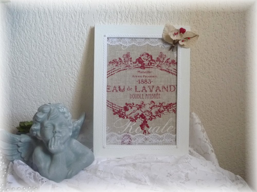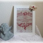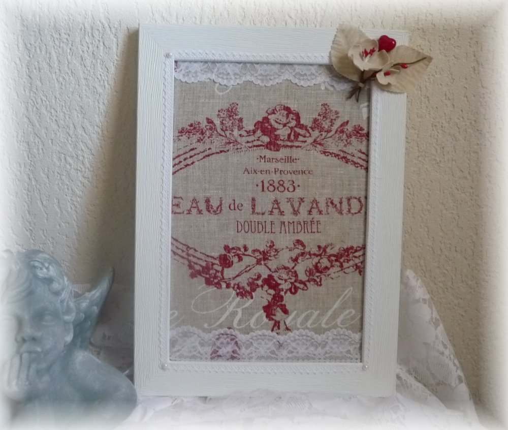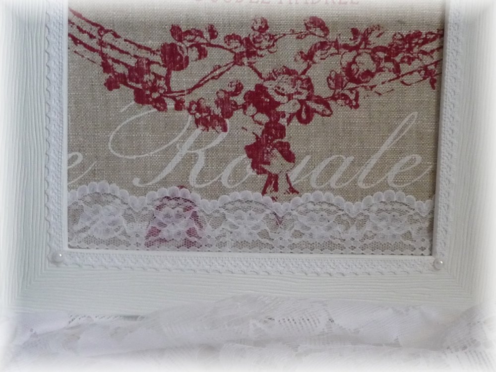 Cadre en bois peint en blanc , dont le fond est décoré d'un tissu en lin " Eau de lavande " de style vintage , large dentelle, fleurs en lin et demi perles nacrées