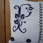 La lettre P, brodée au point de croix sur une toile aïda blanche avec un fil DMC bleu marine apporte un charme authentique et intemporel. Le dos est réalisé avec un tissu 100% coton bleu marine à pois blancs.