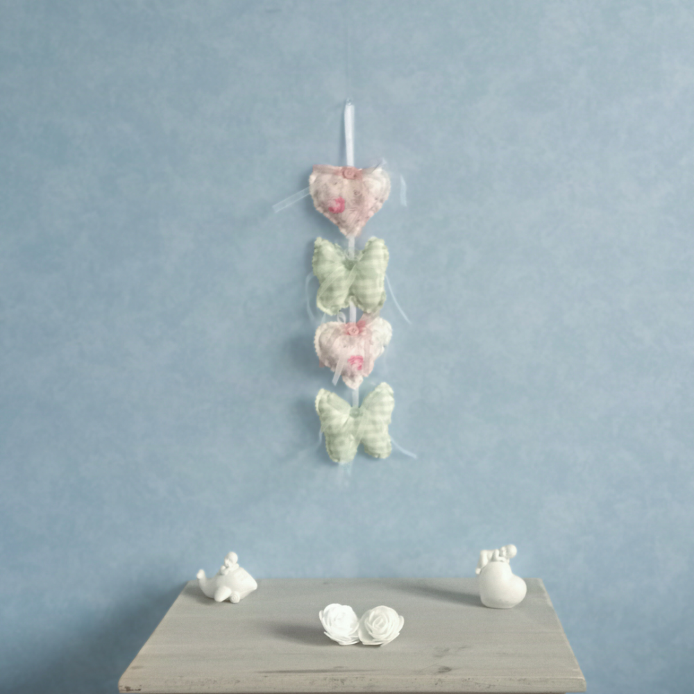 Une guirlande qui vole entre douceur et fantaisie Deux cœurs fleuris, deux papillons vichy, reliés par un ruban blanc comme un fil de printemps. Cette guirlande textile est une pièce unique, cousue main avec des tissus légers et des détails charmants.