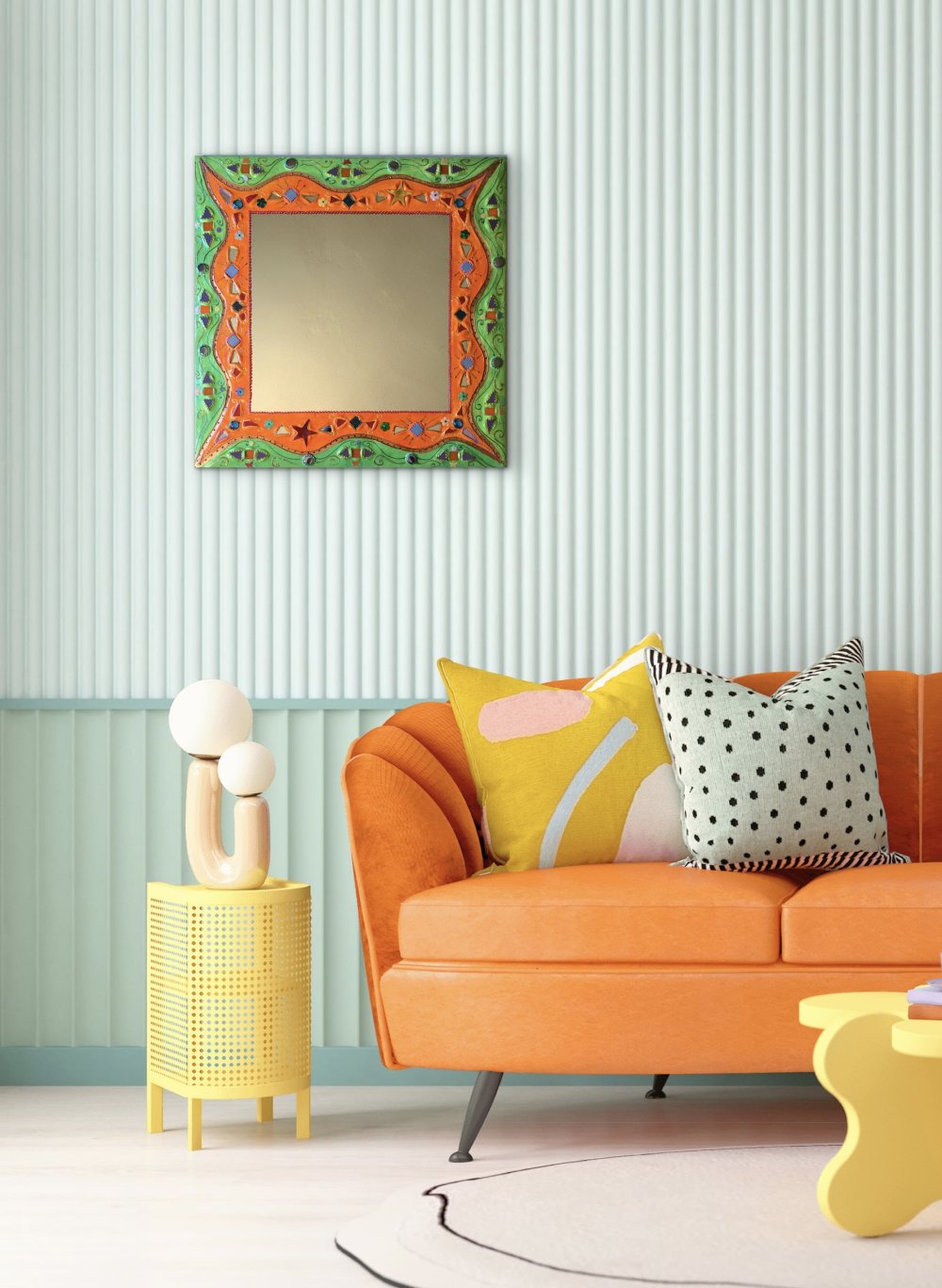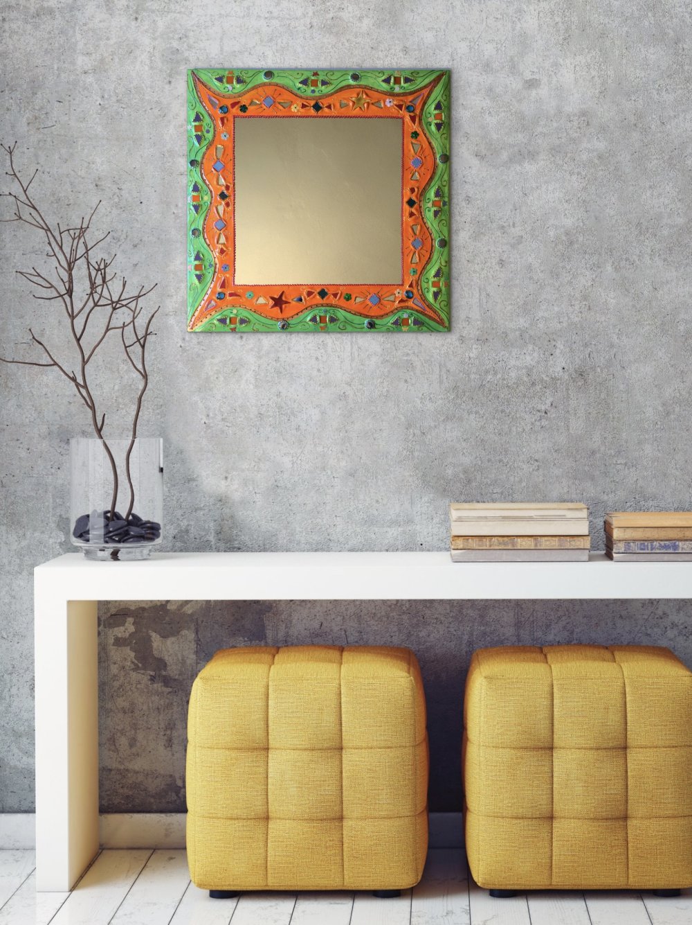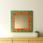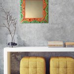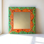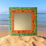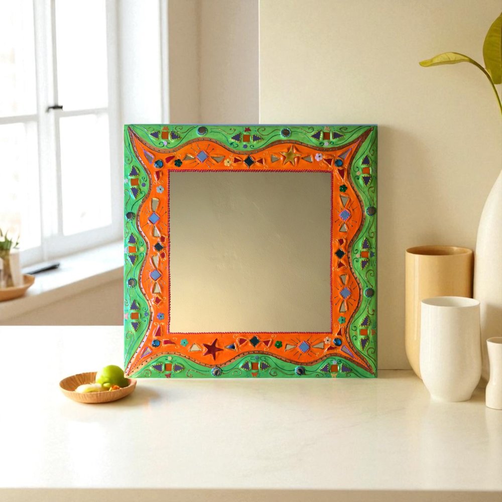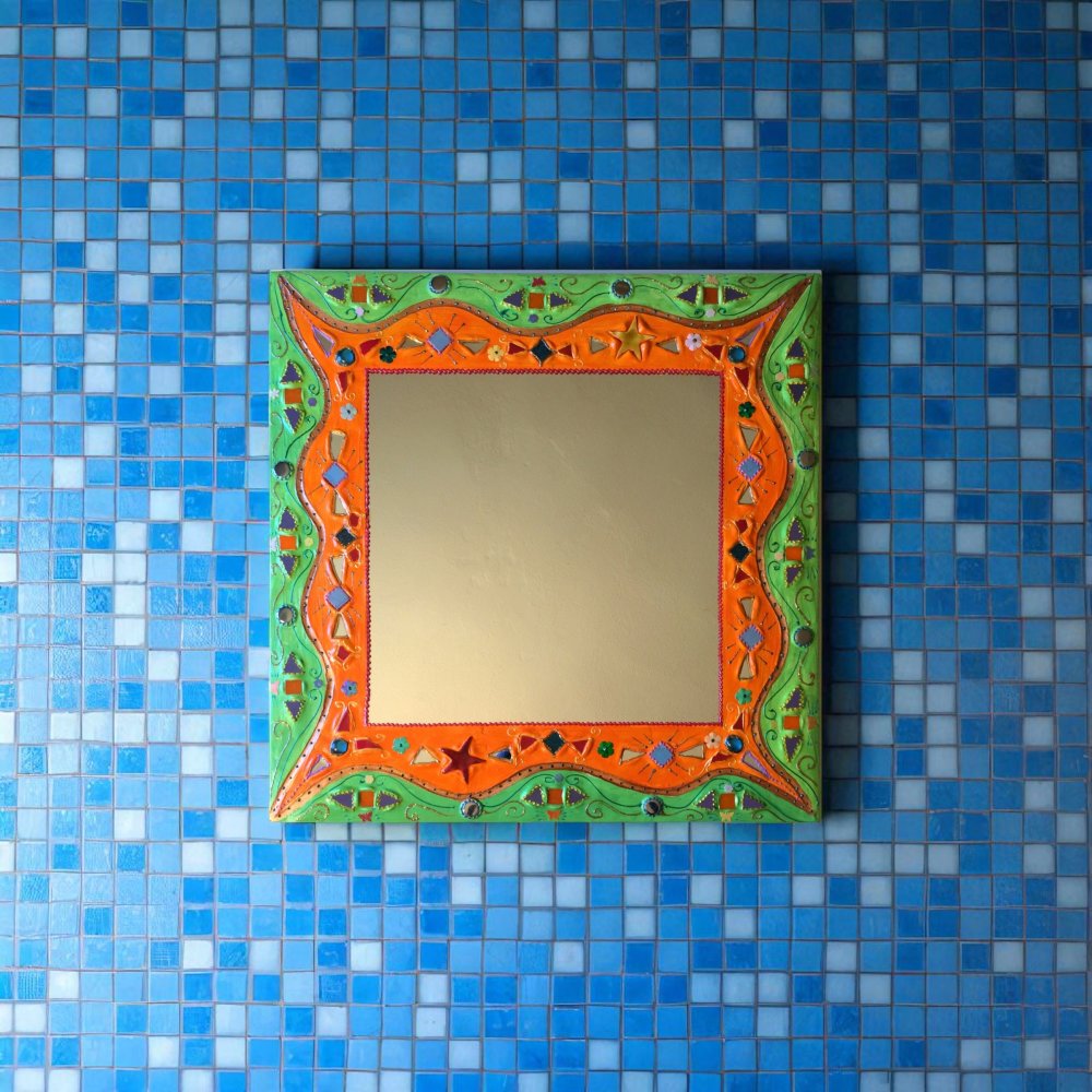 miroir mural carré "orange ,vert étoiles " en peinture et mosaïque,cadeau original,pièce unique art, décoration d’intérieur colorée