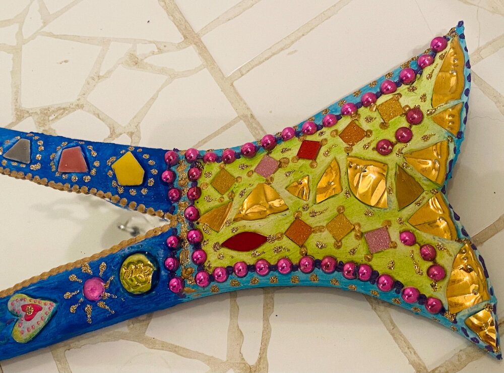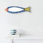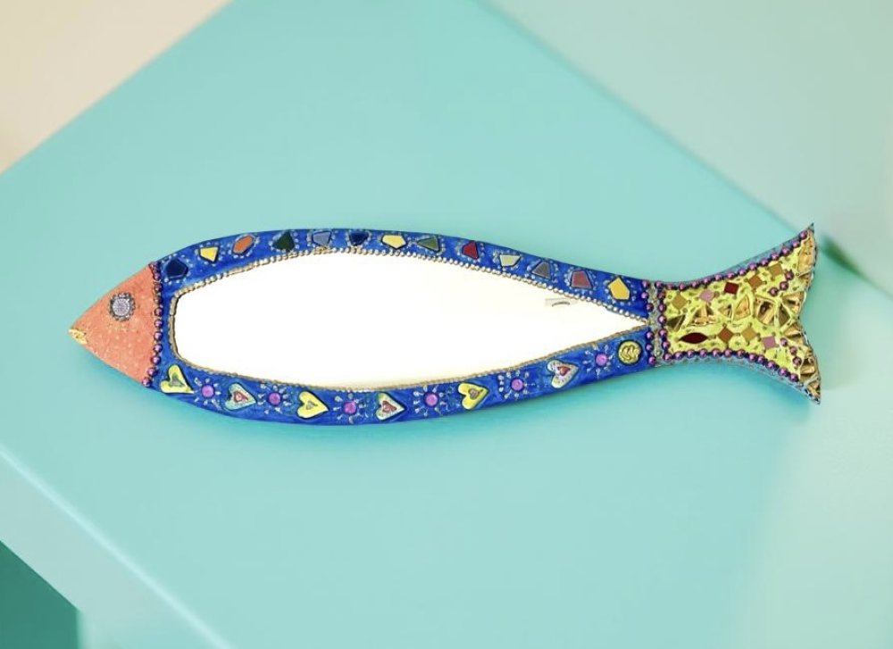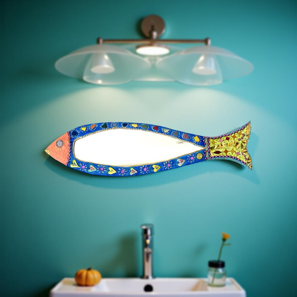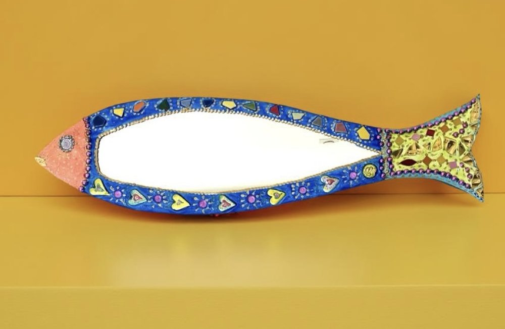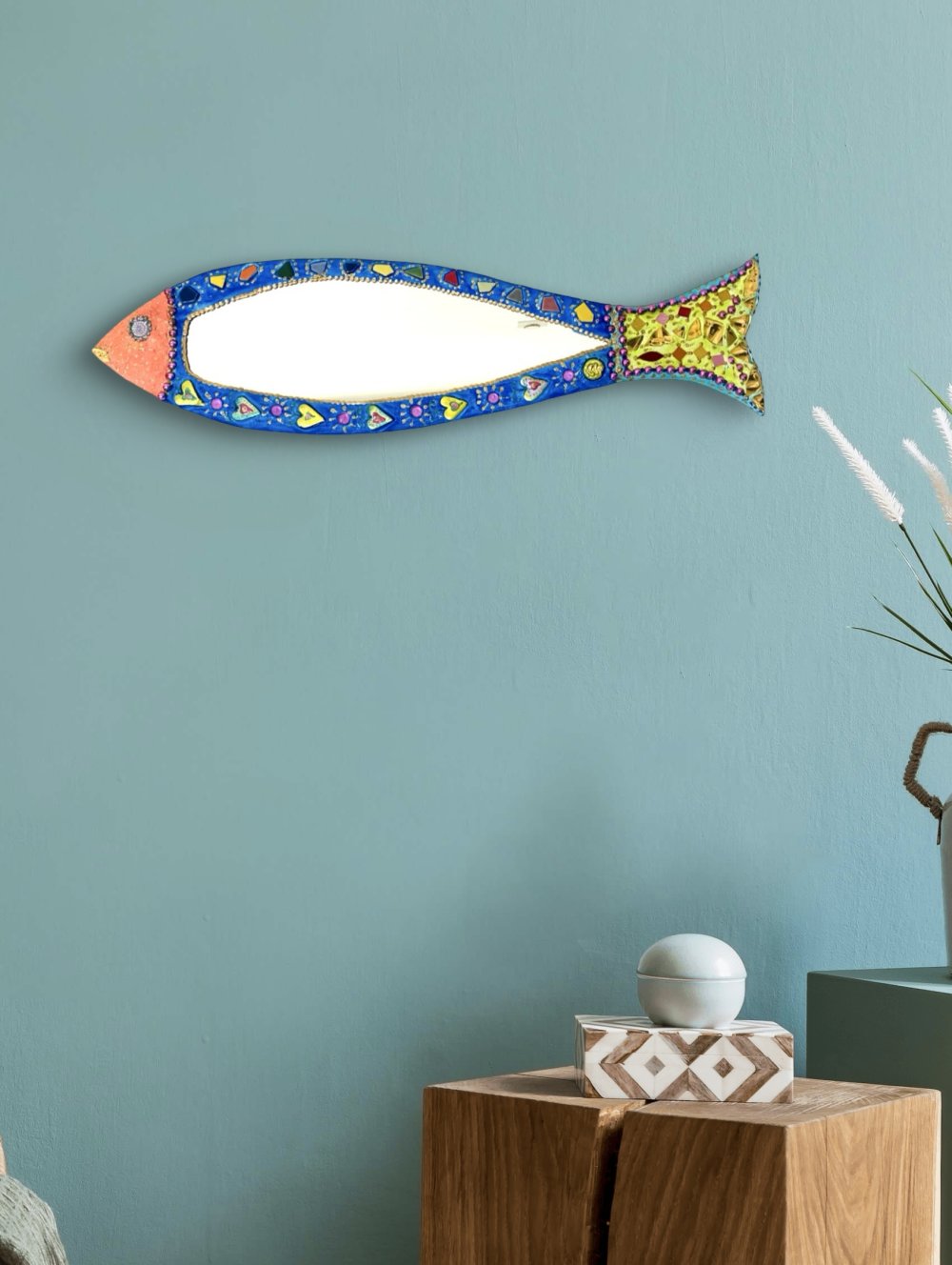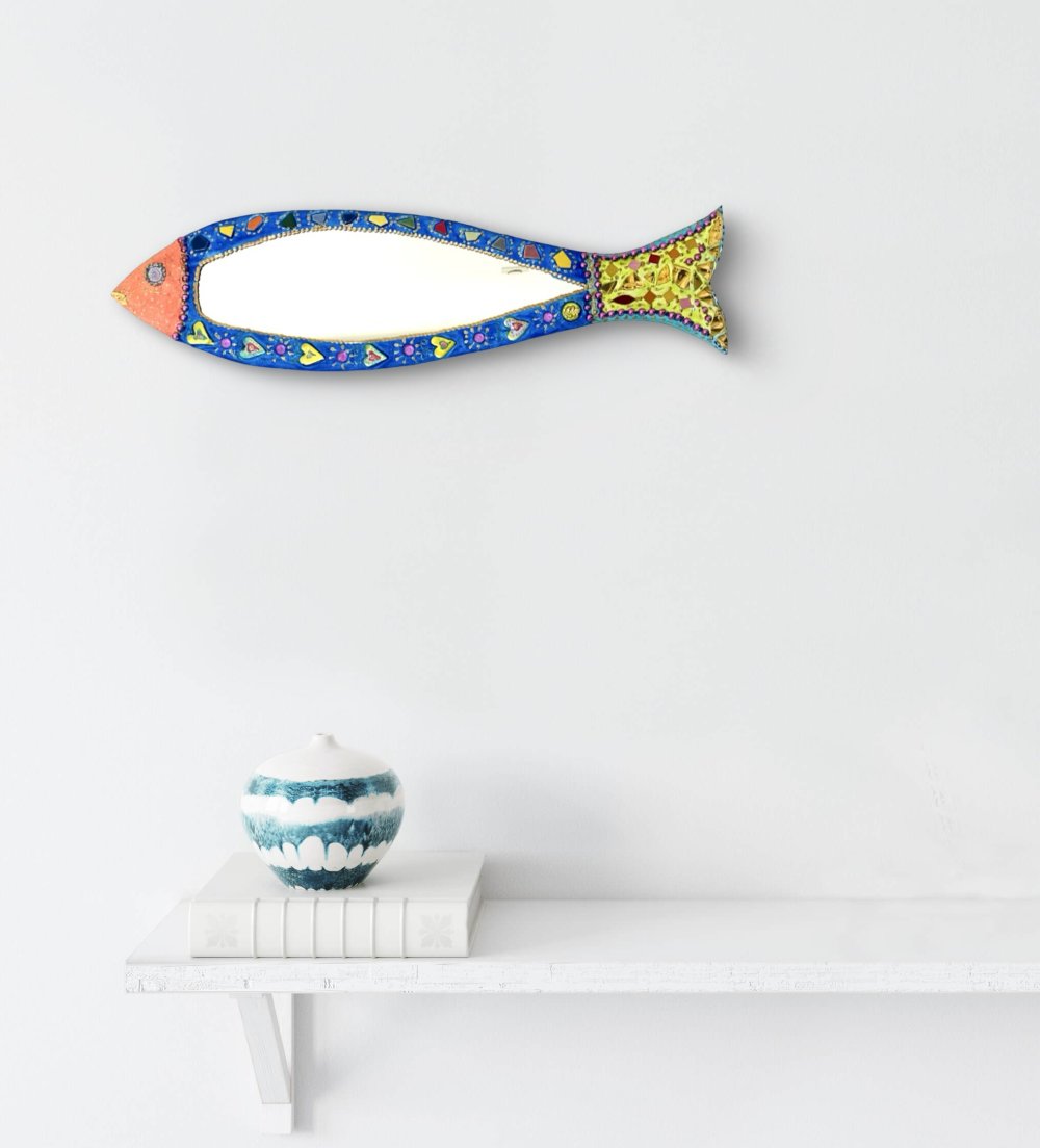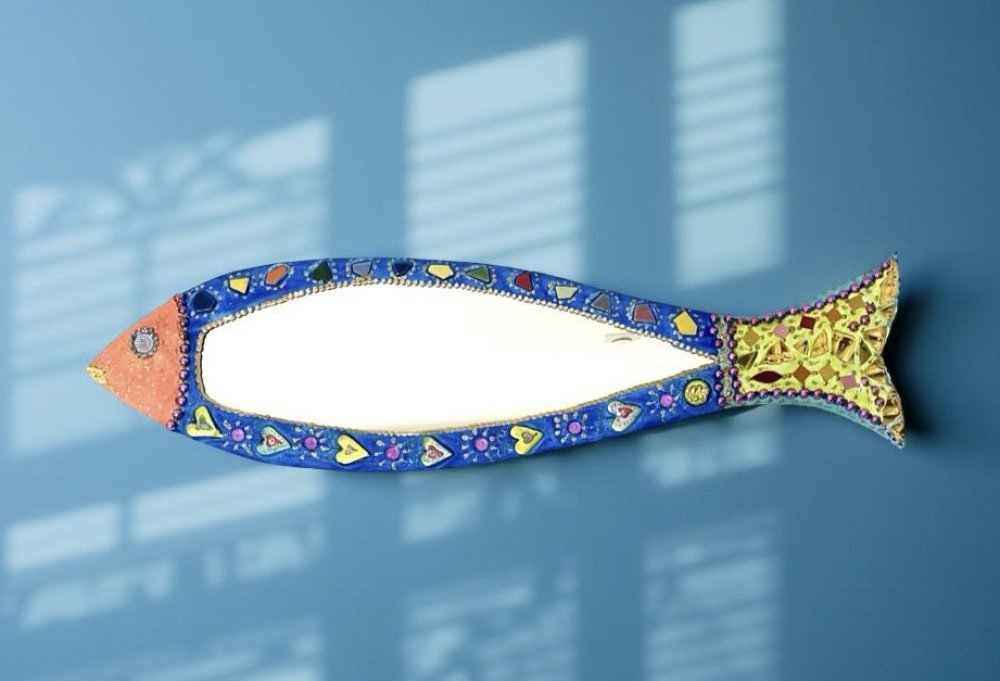 miroirs poissons art mural unique fait à la main en mosaïque et peinture colorée avec des motifs artistiques ,décoration murale art design