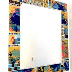miroir de verre coloré. j'ai imaginé et réalisé ce miroir féérique en mosaïque de verre ,travaillé sur un support en bois CP 66 X 56 cm ,j'ai collé un miroir 40 X 50 cm ;la mosaïque est composée d' émaux de verre carrés de différentes tailles et multicolores ,du verre découpé dans des tableaux que j'ai peint à l'envers, (technique Sénégalaise) avec des dominantes d'or et de bleus pour celui-ci un aspect magique et féérique ,inspiré des fêtes de Venise ,décoration murale: pour la salle de bain ou décorer votre intérieur avec une pièce unique de qualité. pièce unique signée Odile Maffone fait avec mon imagination avec mes tableaux de verre peint uniques. réalisé dans mon atelier en Drôme provençale ,France