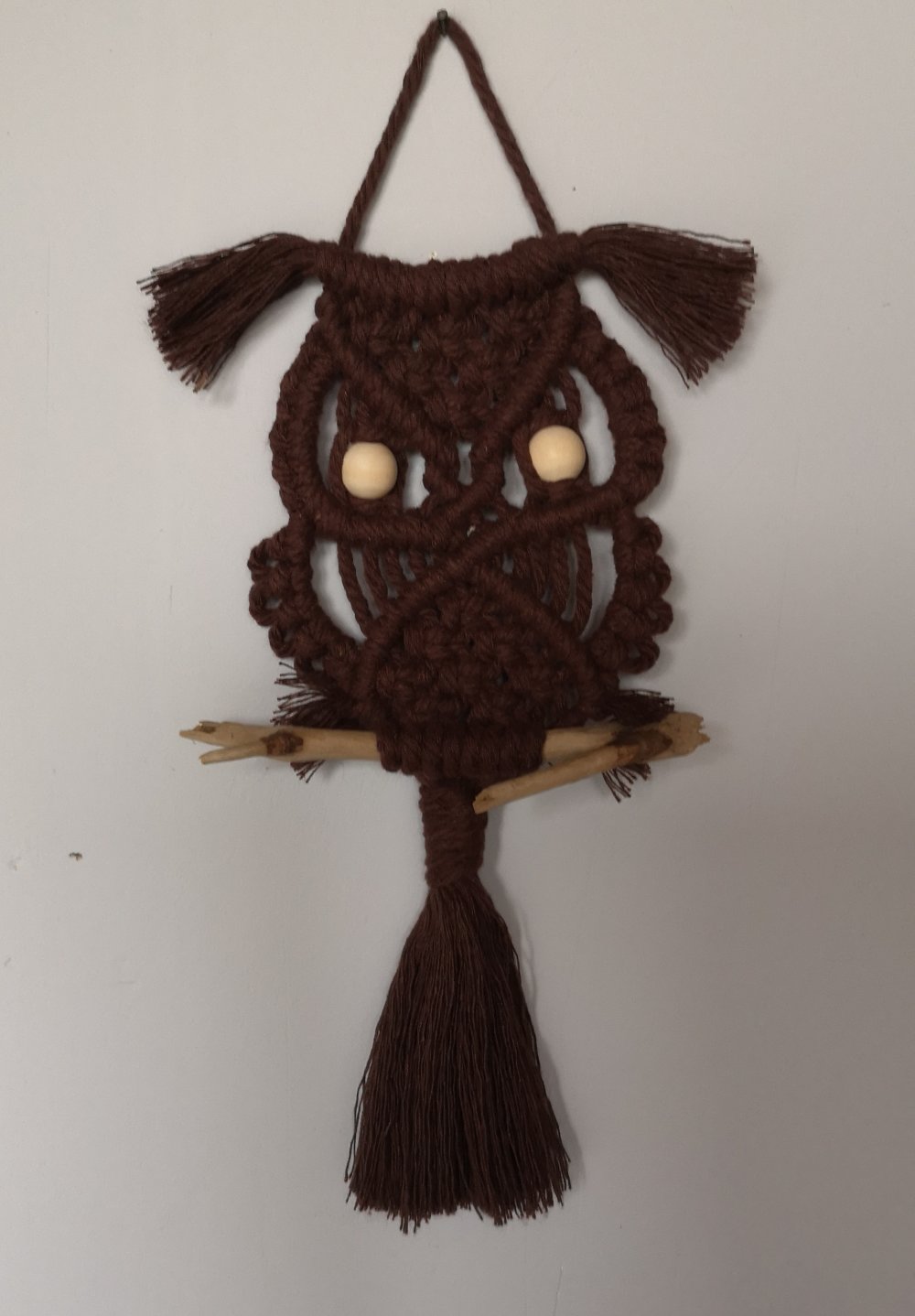 Laissez entrer une note de douceur et de caractère dans votre intérieur avec ce hibou en macramé, patiemment tissé à la main en coton couleur chocolat.