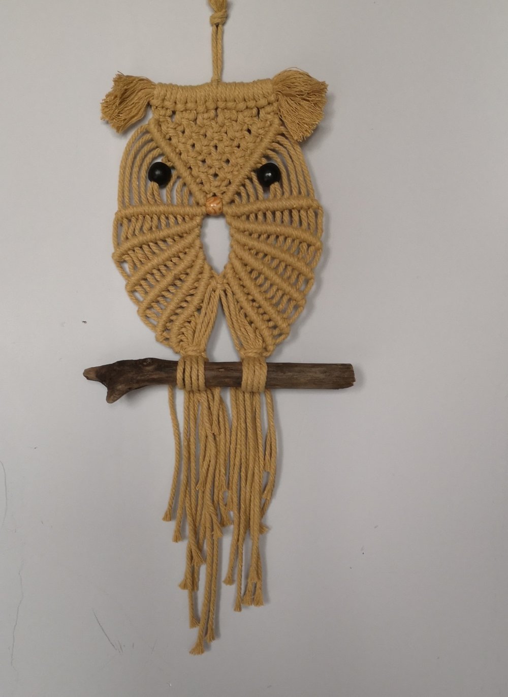 Laissez entrer une note de douceur et de caractère dans votre intérieur avec ce hibou en macramé, patiemment tissé à la main en coton moutarde.