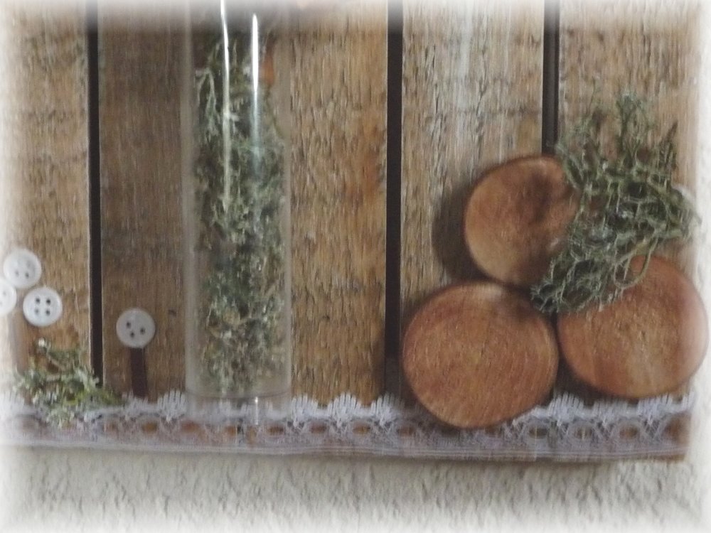 Fait avec des rondins e bois,bois flotté,mousse naturelle, boutons , dentelle et deux véritables fleurs de coton sur des planches de palette